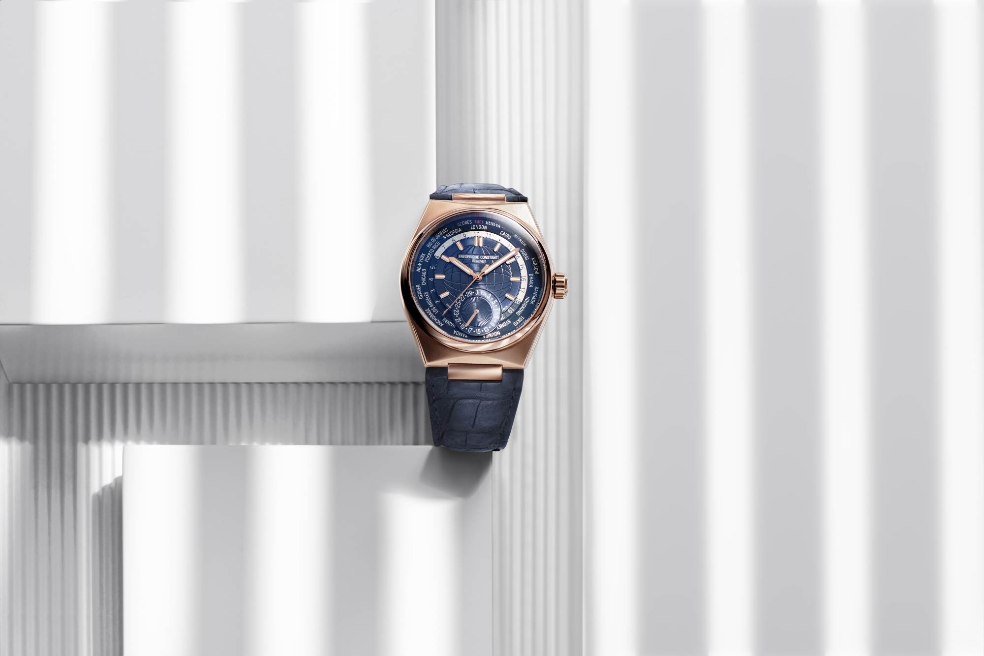 Frederique Constant zvolil pro tuto edici číselník v petrolejově modré barvě, která je dostatečně jemná, aby odhalila odstíny vyryté na jeho povrchu: symbol Země s vyznačením zeměpisné šířky, délky a sluneční paprsek na datumovce, která se nachází na 6. hodině. Číselník je opatřen luminiscenčními, zlatě zbarvenými hodinovými indexy, které ladí se třemi středovými ručkami zobrazující hodiny, minuty a sekundy.