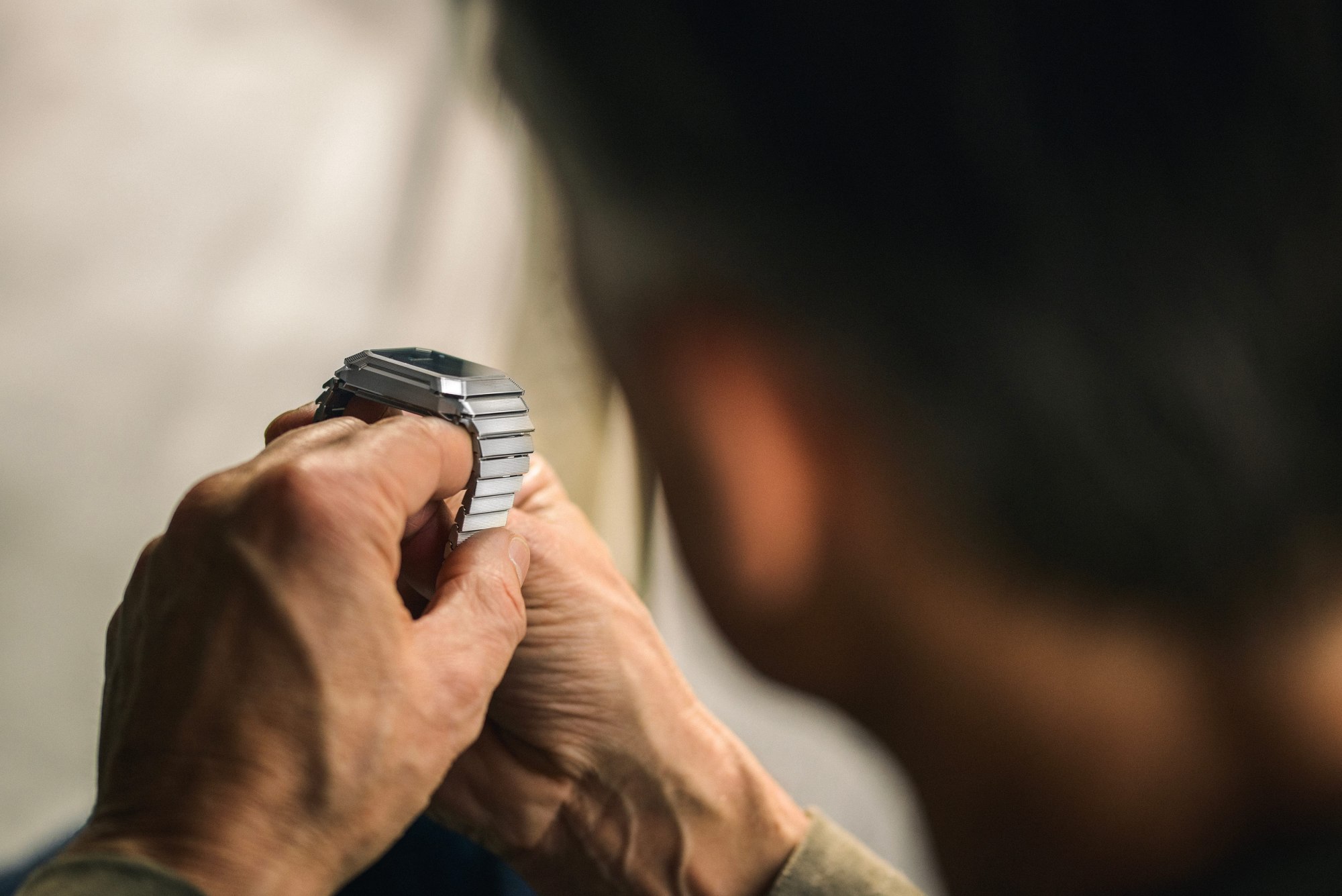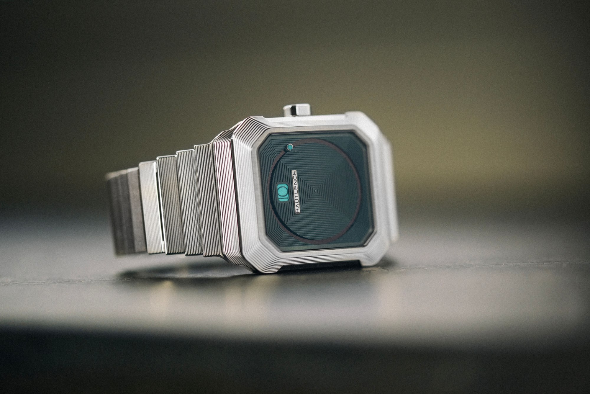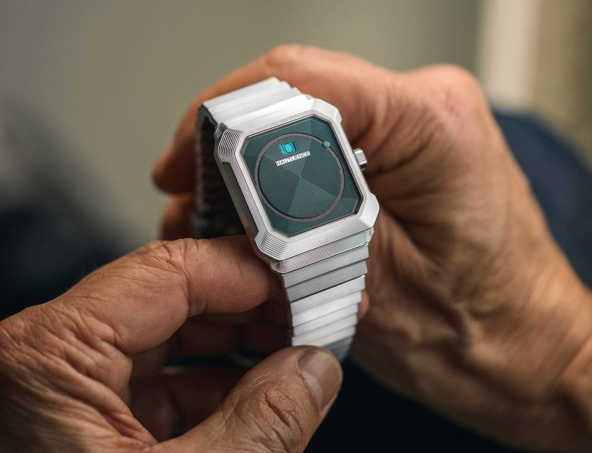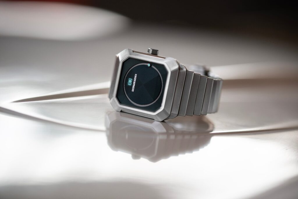 Největší revoluce se ale odehrává na číselníku. Žádné ručky. Hodiny se zobrazují v okénku pomocí skokového mechanismu, který každých 60 minut dramaticky „přeskočí“ na další hodnotu. Minuty jsou naopak zobrazeny periferně – tyrkysový kurzor obíhá po skrytém okraji číselníku a vytváří hypnotický, téměř futuristický efekt.