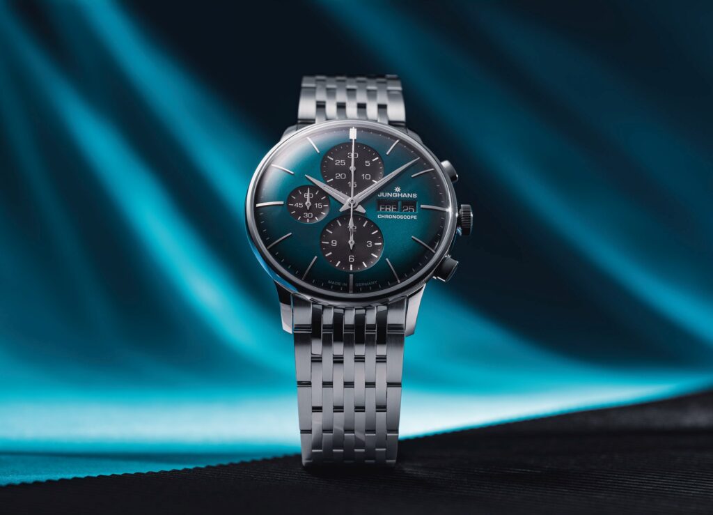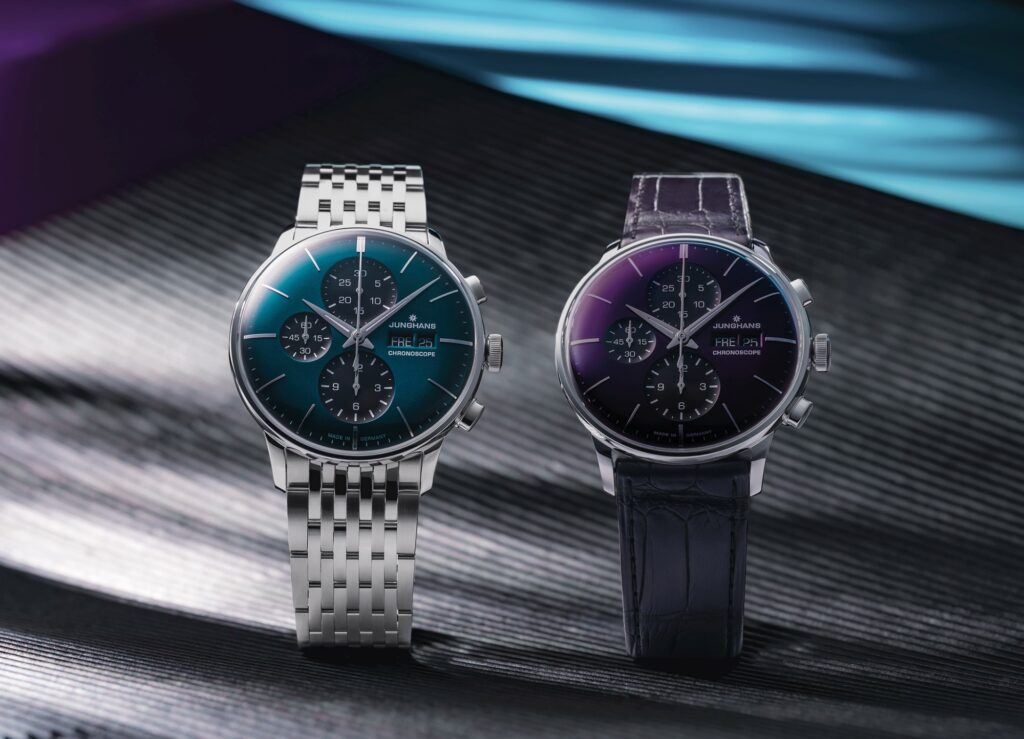 Jsou chvíle, kdy vás barva zasáhne dřív než tvar. Není to logické, ale funguje to. Temně petrolejová, připomínající hladinu oceánu těsně před bouří. Nebo hluboká fialová, jako poslední světlo dne, které se ztrácí za obzorem. A přesně s těmito emocemi pracuje nový Junghans Meister Chronoscope.