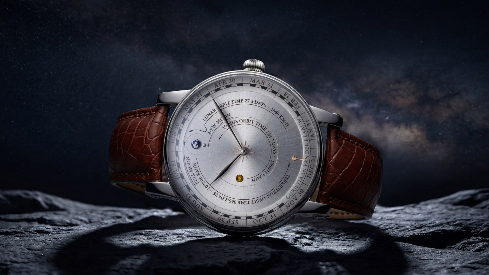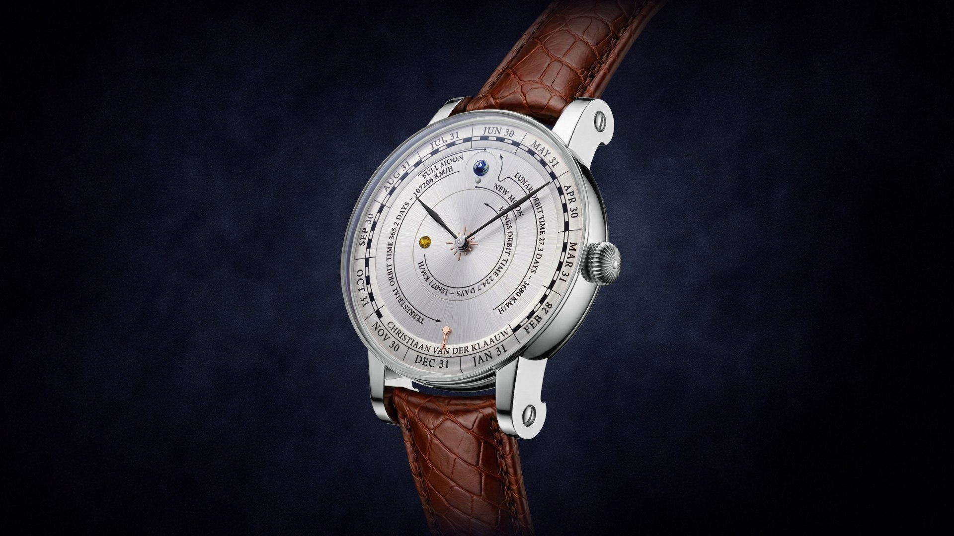 Naopak Christiaan van der Klaauw Venus Annual Calendar představuje techničtější interpretaci. Vnější kruh ciferníku zobrazuje jednotlivé dny v rámci měsíců a automaticky reflektuje jejich rozdílnou délku – korekce je nutná pouze jednou za čtyři roky. Na discích se navíc objevují konkrétní astronomické údaje: Země obíhá Slunce za 365,2 dne rychlostí přes 107 000 km/h, zatímco Venuše dokončí svůj oběh za 224,7 dne rychlostí více než 126 000 km/h.