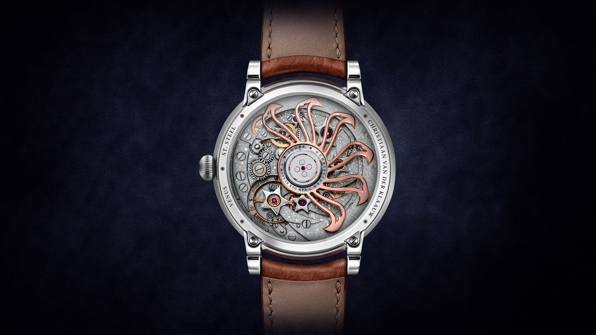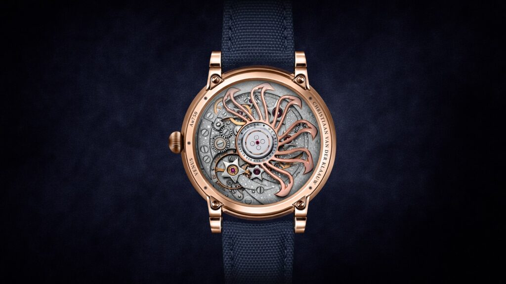 Model Christiaan van der Klaauw Venus Zodiac pracuje s poetikou noční oblohy. Aventurinový ciferník vytváří hluboký, hvězdami posetý prostor, v němž se odehrává jemná choreografie nebeských těles. Součástí zobrazení je i znamení zvěrokruhu, v němž se aktuálně nachází Slunce, a inovativně pojaté fáze Měsíce – definované skutečnou pozicí Měsíce mezi Zemí a Sluncem.