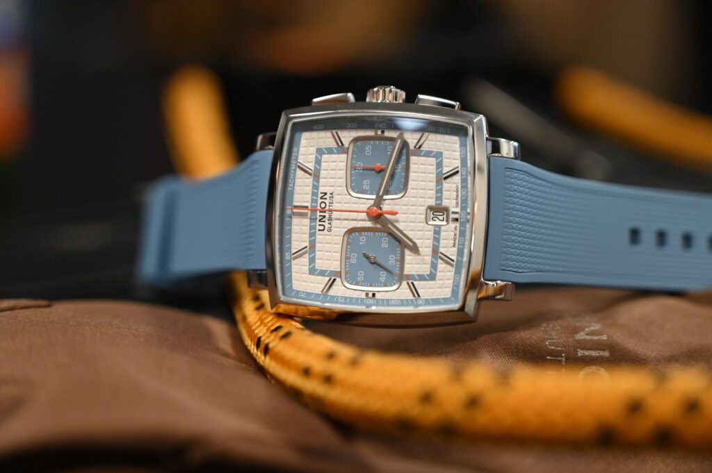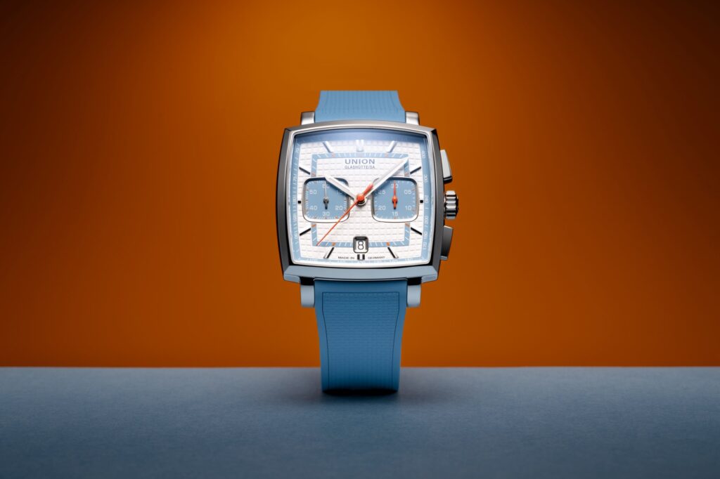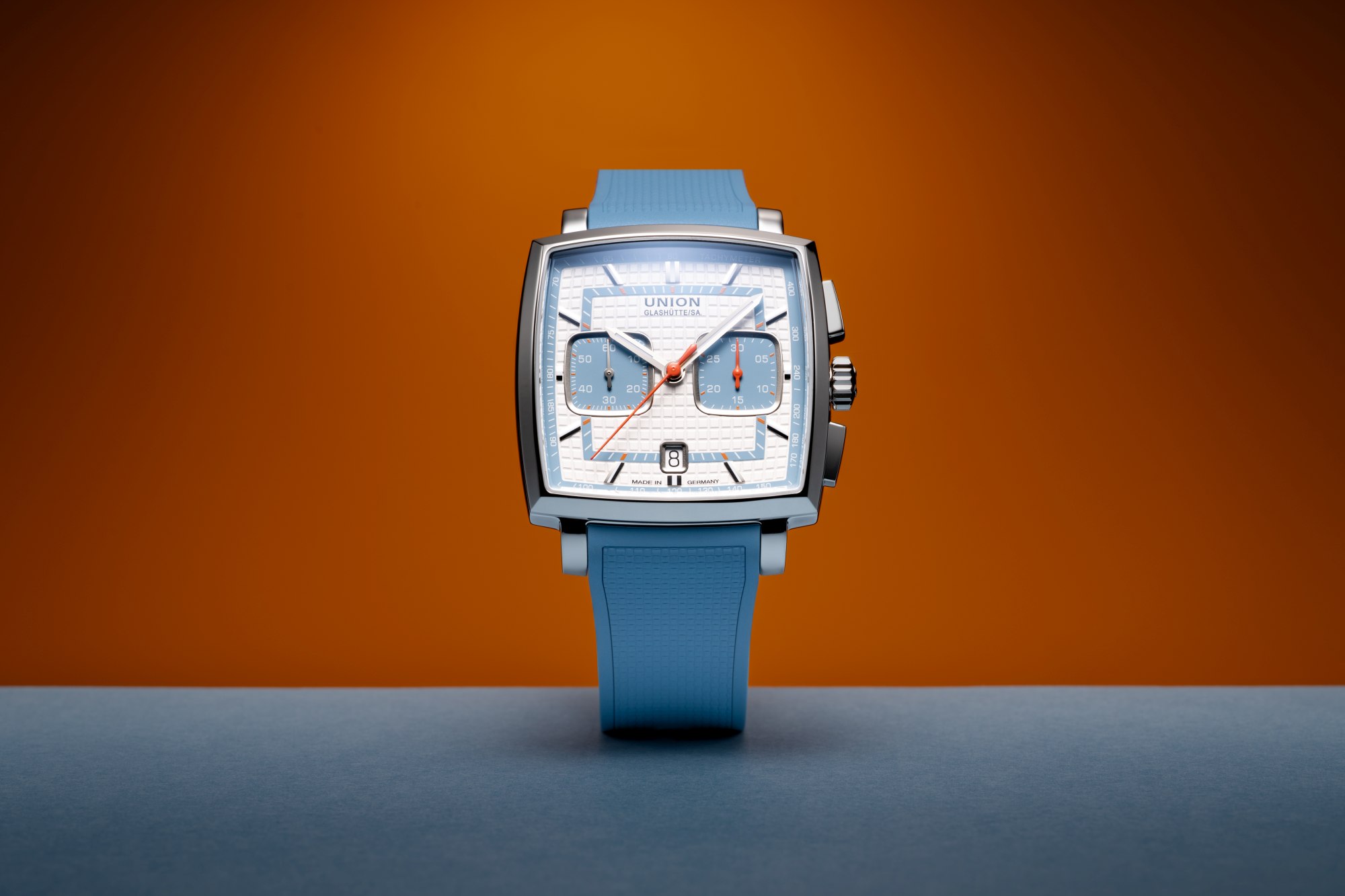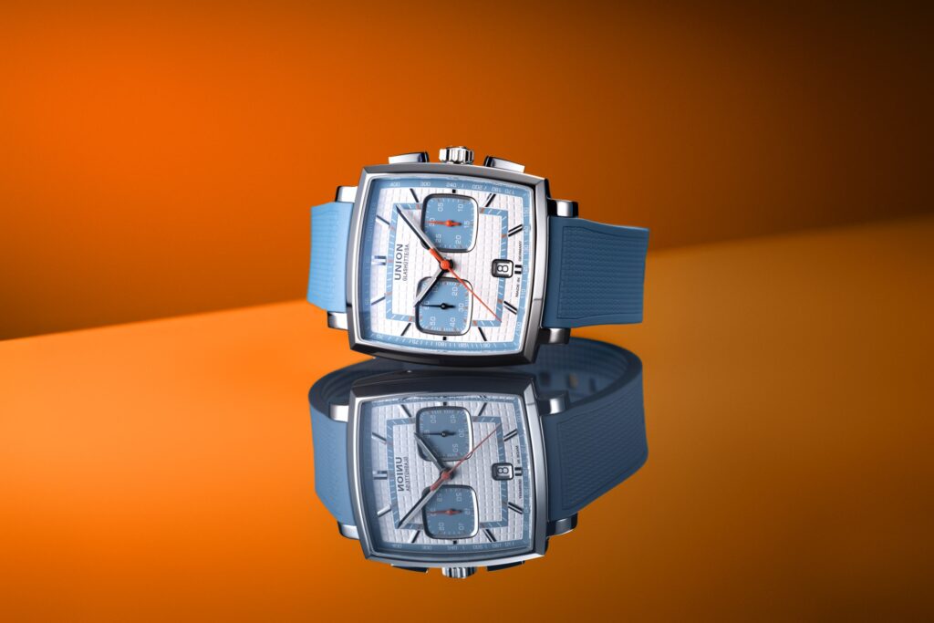 Barevné provedení hraje klíčovou roli. Varianta s bílým ciferníkem a světle modrými akcenty působí svěže, téměř technicky čistě – jako ranní nebe nad závodní tratí. Oranžové lakované ručky chronografu přinášejí energii, napětí a okamžitou čitelnost, podobně jako ručka tachometru ve sportovním voze. Jasně, kombinace asociuje olejáře Gulf, ale jinak, než tomu je u TAG Heuer Monaco. Prostě po svém….