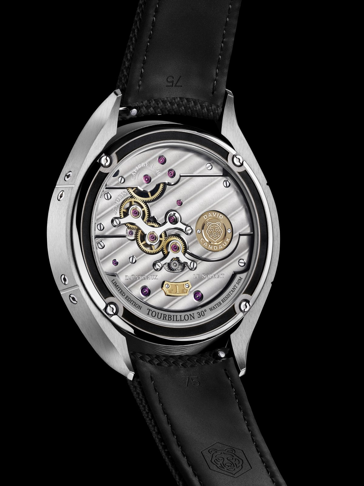 Uvnitř pracuje in-house kalibr H74. Můstky i základna z titanu páté třídy přinášejí nízkou hmotnost, antimagnetické vlastnosti a tepelnou stabilitu. Srdcem strojku je 3Hz létající tourbillon nakloněný o 30°, který díky své geometrii efektivněji kompenzuje polohové odchylky při nošení na zápěstí. Jednu rotaci dokončí za 60 sekund a současně nese i malou sekundovou ručku. Energeticky náročný systém vydrží při plném nátahu 55 hodin, k čemž jsou ovšem za potřebí hned dva pérovníky.