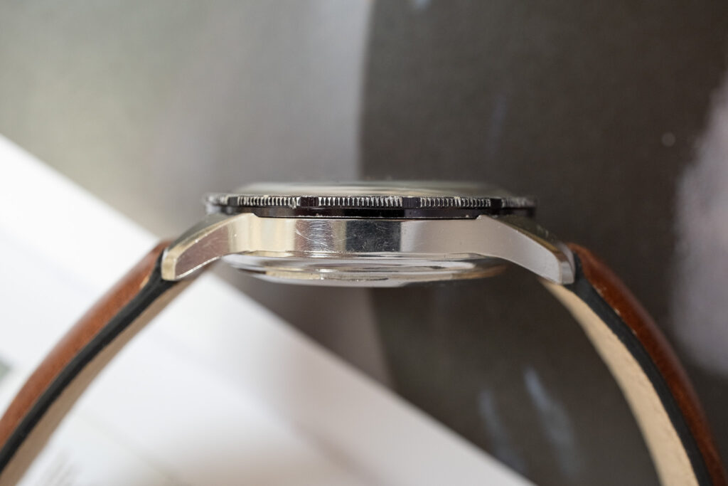 The 41 mm steel case with a rotating bezel gives the watch a modern, sporty look—far removed from the smaller dress watches of the 1950s.