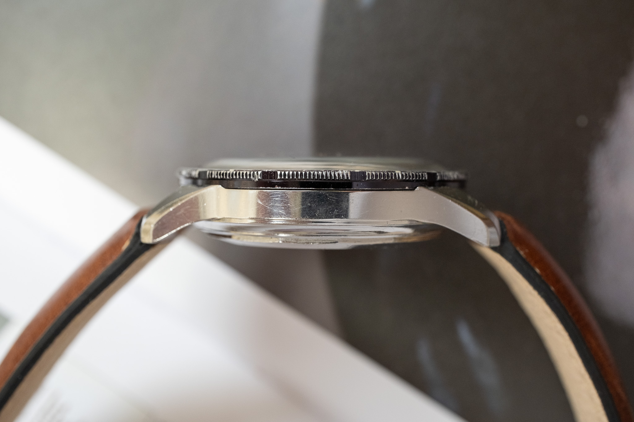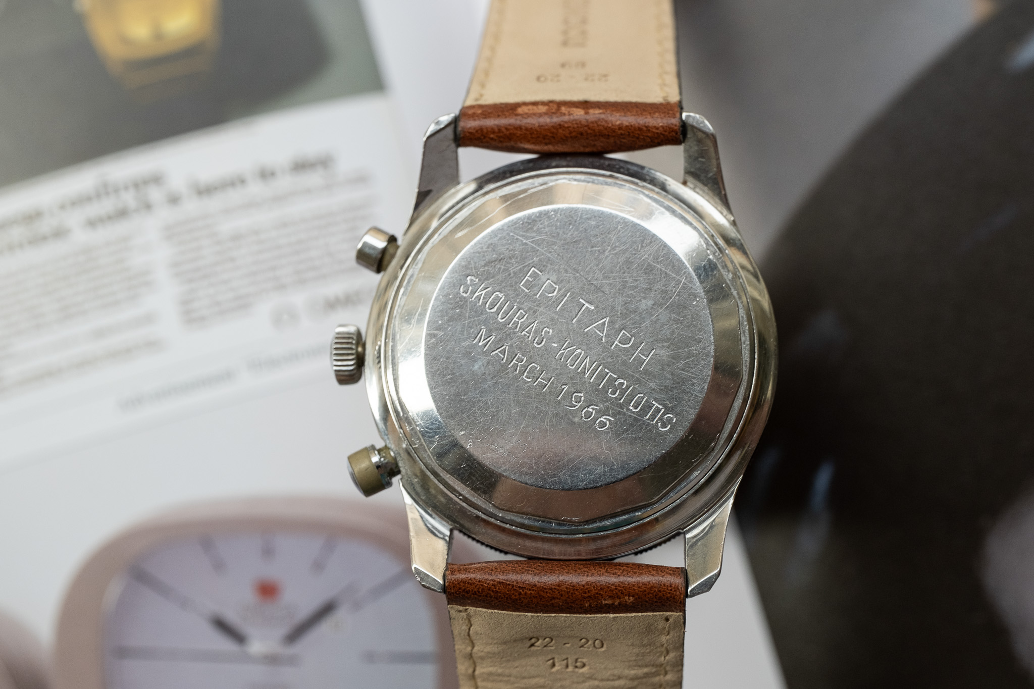 Turn the watch over and instead of the typical polished caseback seen on Aero-Compax chronographs, you find an old-school engraving—essentially the birth certificate of this story: