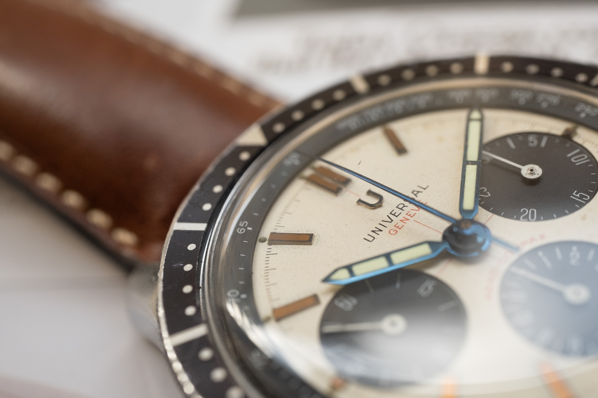 The watch is offered in what collectors call “honest condition.” It is not a safe-queen; it is a watch that lived the life of its owner. Almost all components remain original. The dial has developed a beautiful patina, while the hands were likely restored at some point with refreshed luminous material. The chronograph reset pusher was replaced in the past with a functional alternative—common practice during the socialist era, when original Universal Genève parts were impossible to source.