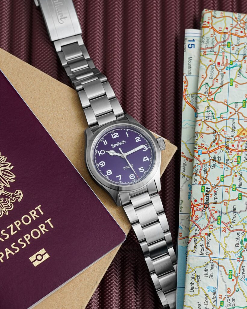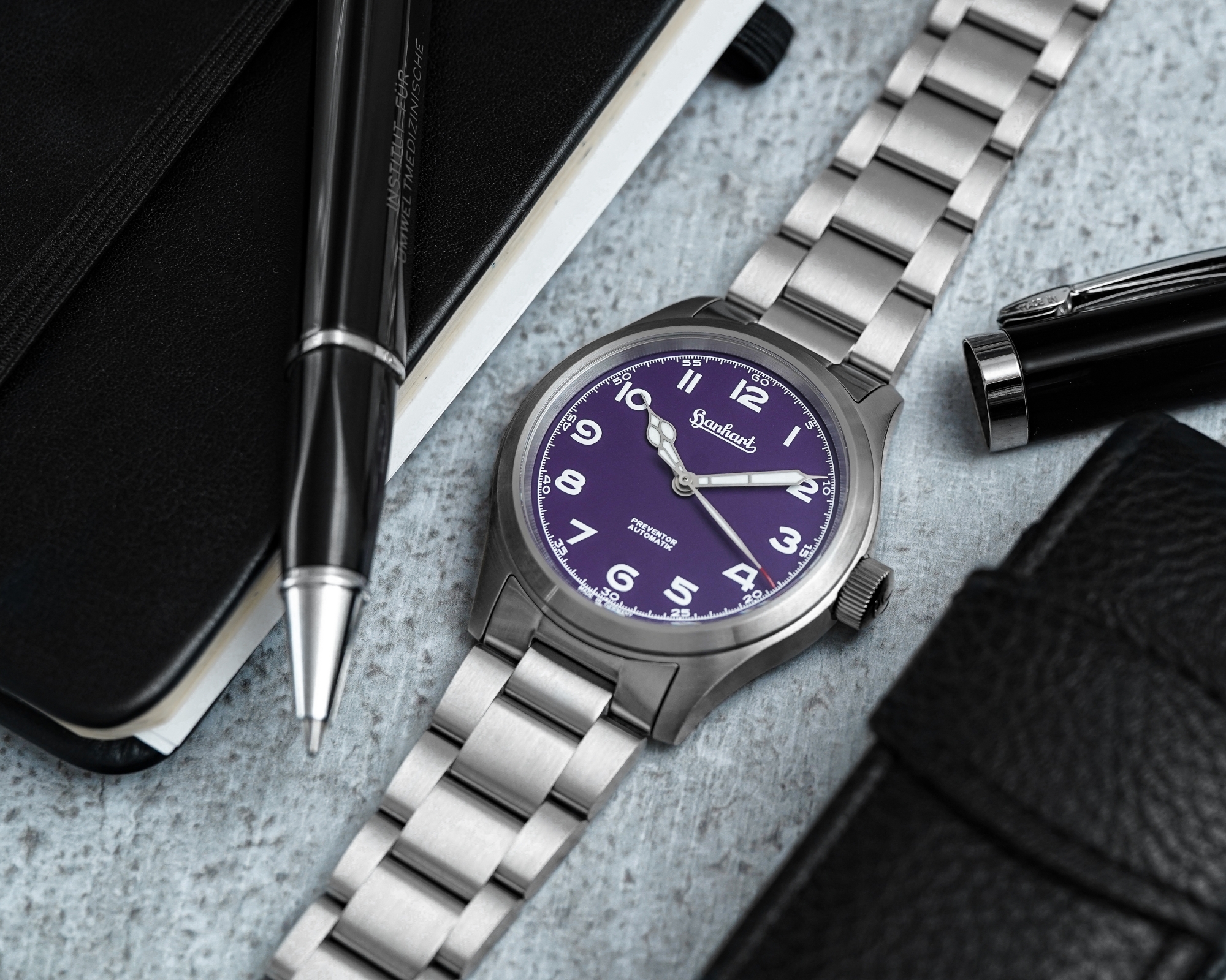 Ciferník v matně tmavě fialovém tónu kontrastuje s bílými arabskými číslicemi, jejichž luminiscenční vrstva Super-LumiNova C1 září zeleně ve tmě. Stejný materiál kryje i skeletonizované ručky odkazující na vojenské kapesní hodinky, a dokonce i jemnou sekundovou ručku s červeně lakovanou špičkou. Dohromady zajišťují čitelnost za každých podmínek – ať už ve dne na horách, nebo při nočních dobrodružstvích.