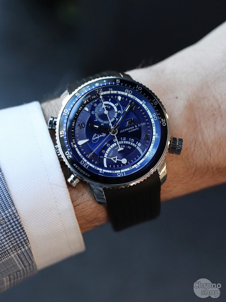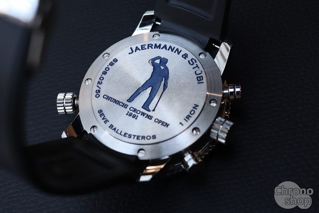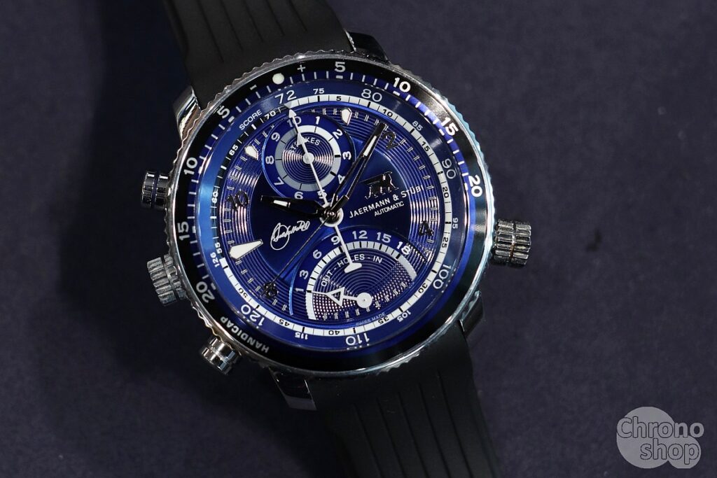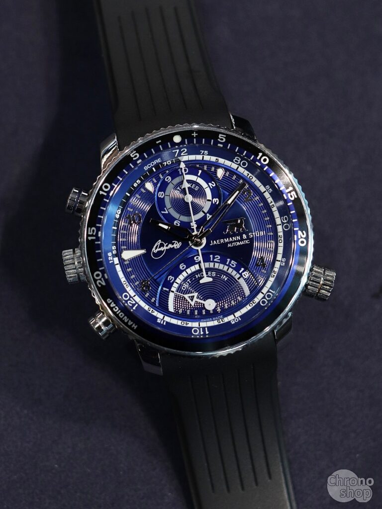 Stejně jako ostatní modely značky Jaermann & Stübi, tak disponuje i tato edice mechanickým golfovým počitadlem: komplikací, která umožňuje zapisovat počet ran na jamce, celkové skóre i porovnání s handicapem. Automatický strojek je zasazen do 44mm pouzdra a doplněn tmavě modrým číselníkem, lunetou i balením ve stejné barvě – oblíbeném odstínu Severiana Ballesterose.