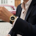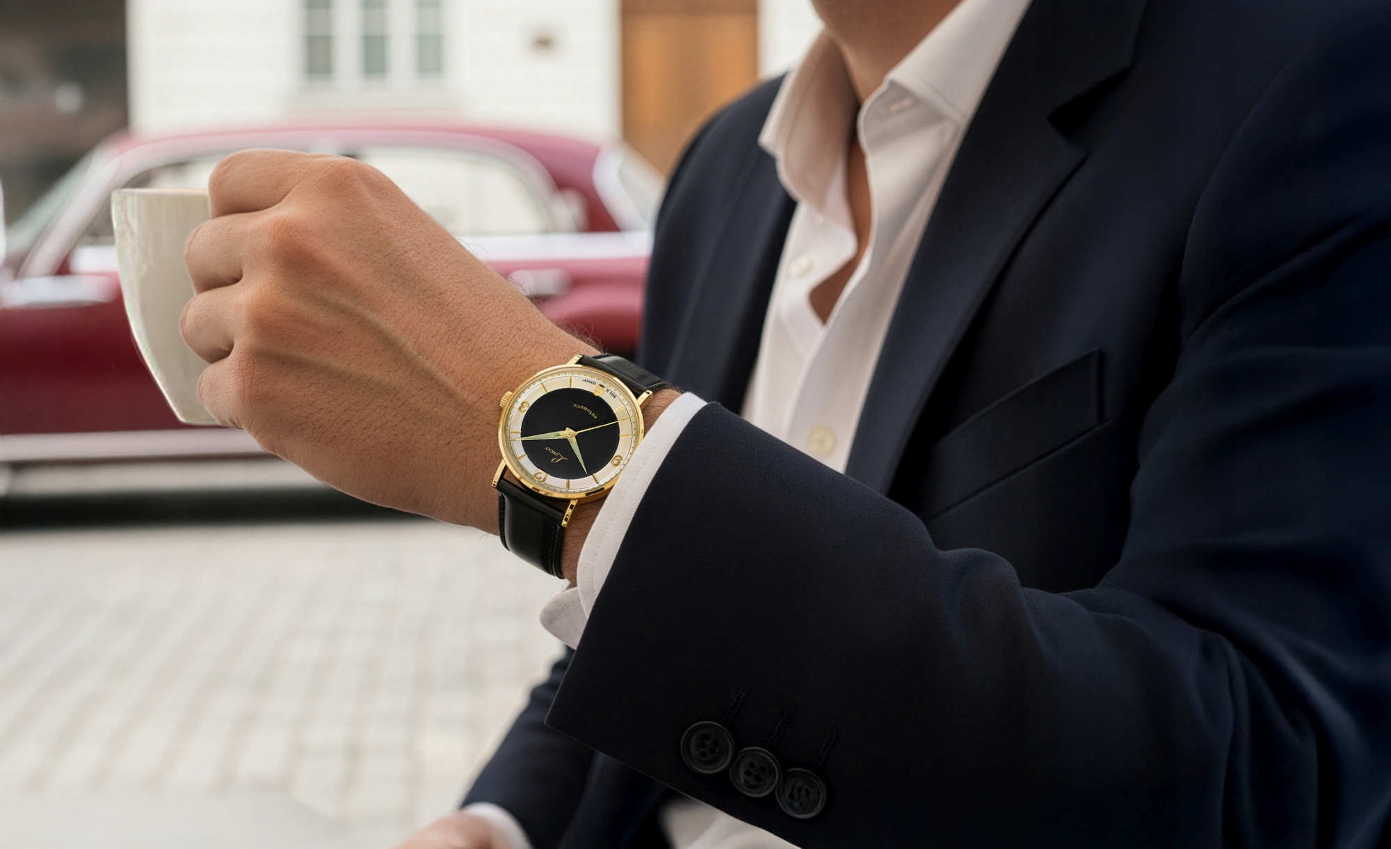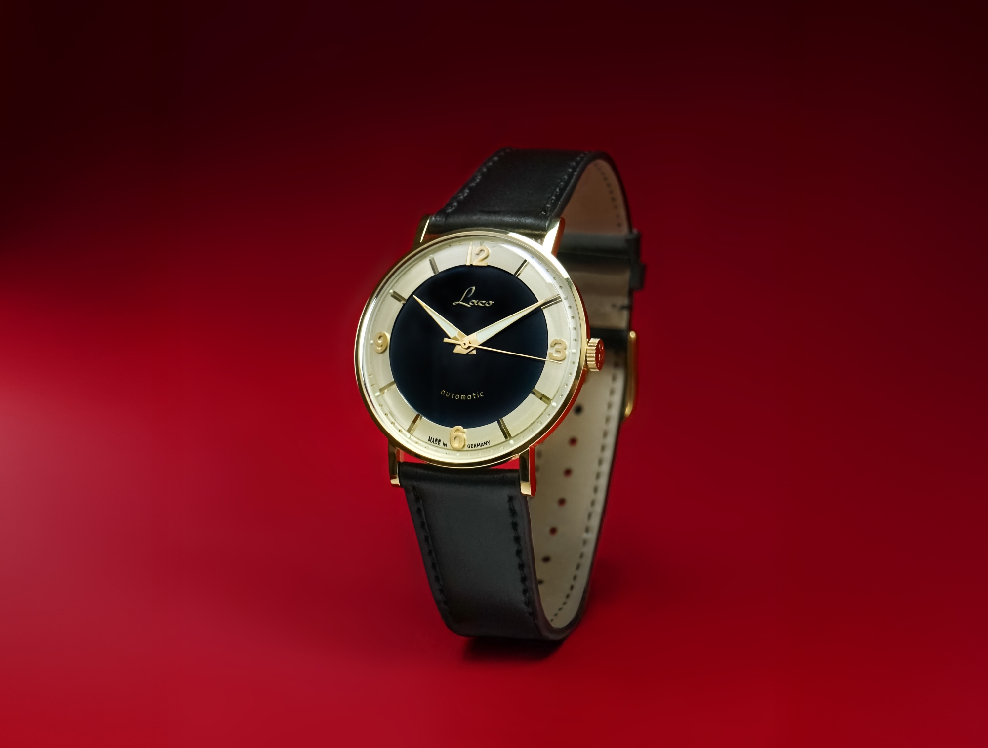Základem novinky je historický model, který vynikal čistými liniemi, vyváženými proporcemi a nenápadnou elegancí typickou pro poválečnou éru. Moderní provedení přináší zachování těchto hodnot, ale v precizně zpracované současné podobě. Zaujme zejména dvoubarevný ciferník: černý střed obklopený jemně lesklým prstencem v odstínu šampaňského vytváří efekt hloubky a vizuální harmonie. Aplikované zlaté číslice, jemně zapuštěné indexy a leštěné ručky v teplém tónu dodávají modelu rafinovaný, ale nikoli okázalý charakter.