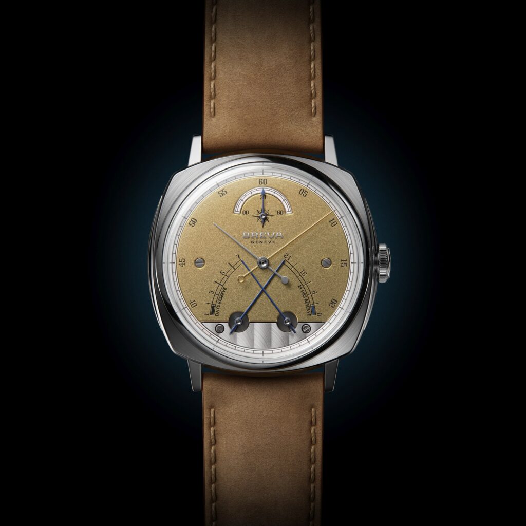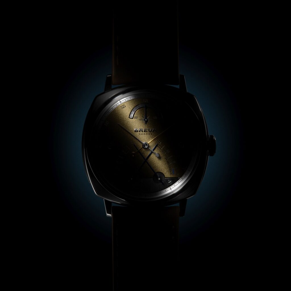Dominantním prvkem je ciferník ve zlatavém odstínu Meridian Gold. Jeho jemně matná, práškově strukturovaná povrchová úprava evokuje patinu historických navigačních nástrojů – sextantů či kompasů. Grafické prvky, jako je větrná růžice na pozici 12 hodin nebo křížené stupnice retrográdních indikací, nejsou dekorací, ale funkčním odkazem na vizuální jazyk vědeckých přístrojů.