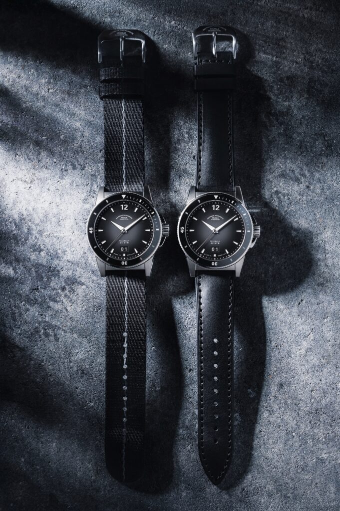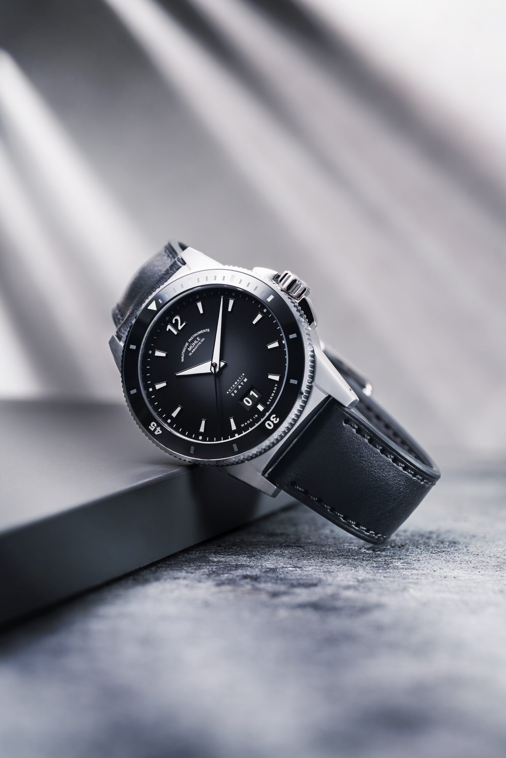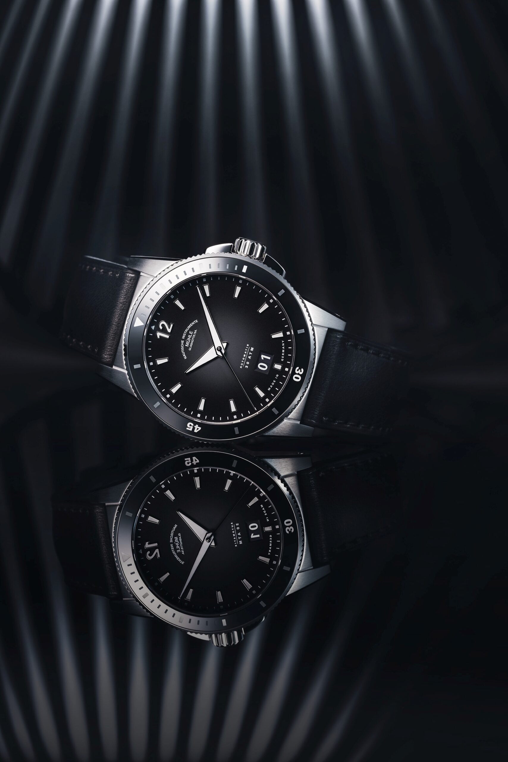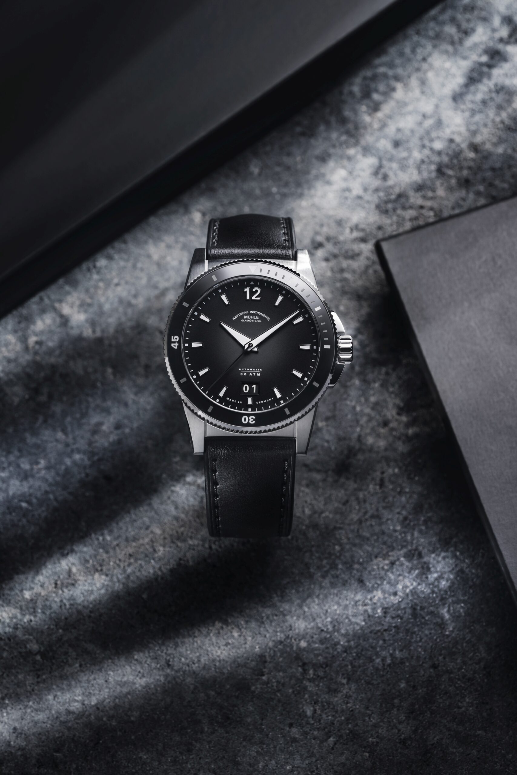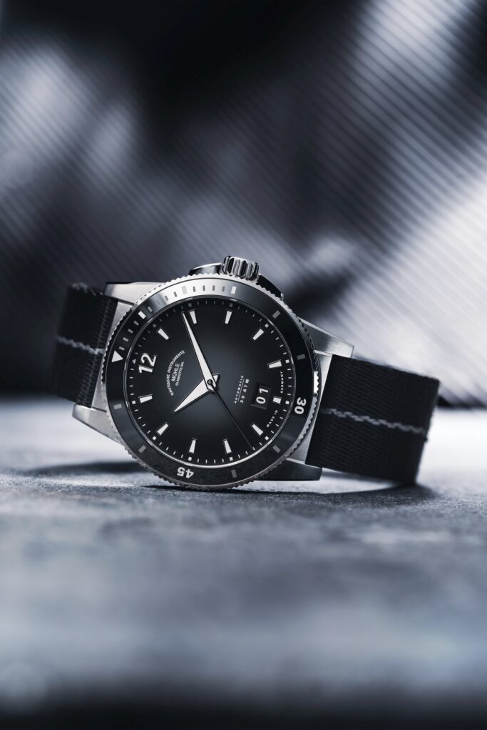 Model Sportivo Big Date navazuje na moderní sportovní linii Sportivo, kterou charakterizuje čistý design, robustnost a nekompromisní čitelnost. Matně černý číselník zdobí výrazné niklové indexy a ručky s vrstvou bílé luminiscence – kontrast, který zaručuje dokonalou viditelnost ve dne i v noci. Datum na pozici 6. hodiny vytváří harmonii s logem rodiny Mühle pod číslicí „12“ a dává ciferníku elegantní symetrii.