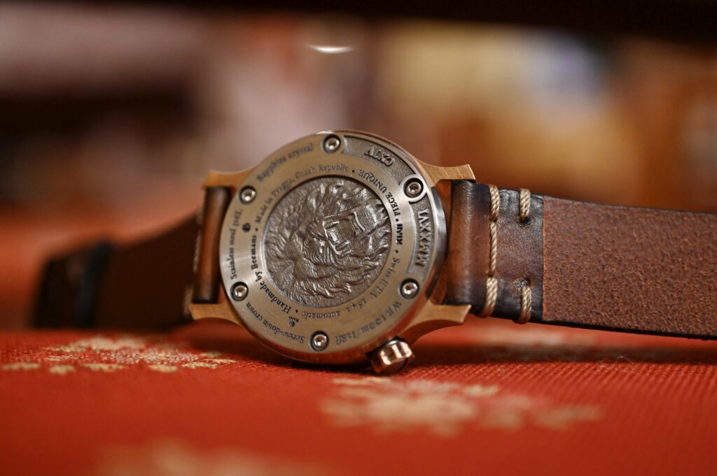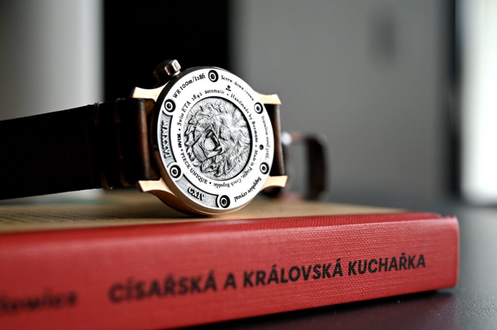 To je samozřejmě, jak už to u hodinek XIIVI bývá, modulární, a tak je v nitru 42mm pouzdra zasazen ocelový kontejner nesoucí hlavu lva – ten se jako symbol českých panovníků objevuje už od 13. století. A víte co? Ten číselník a pouzdro vypadá přesně tak, jakoby je lev svými drápy poškrábal – a to včetně bronzové spony.