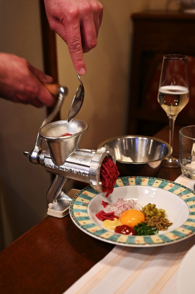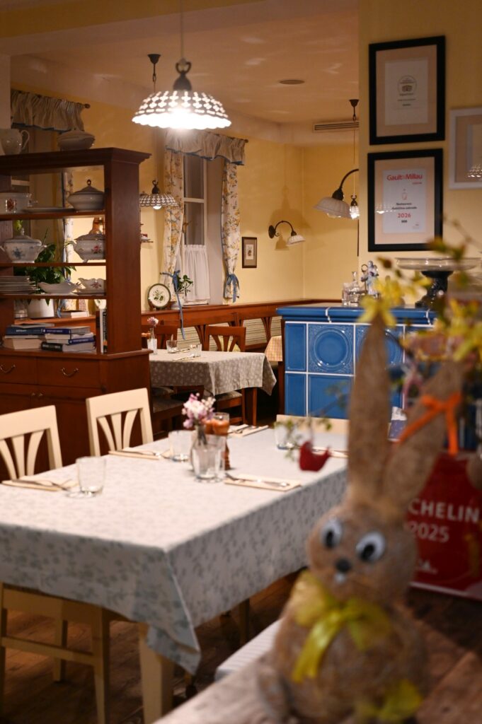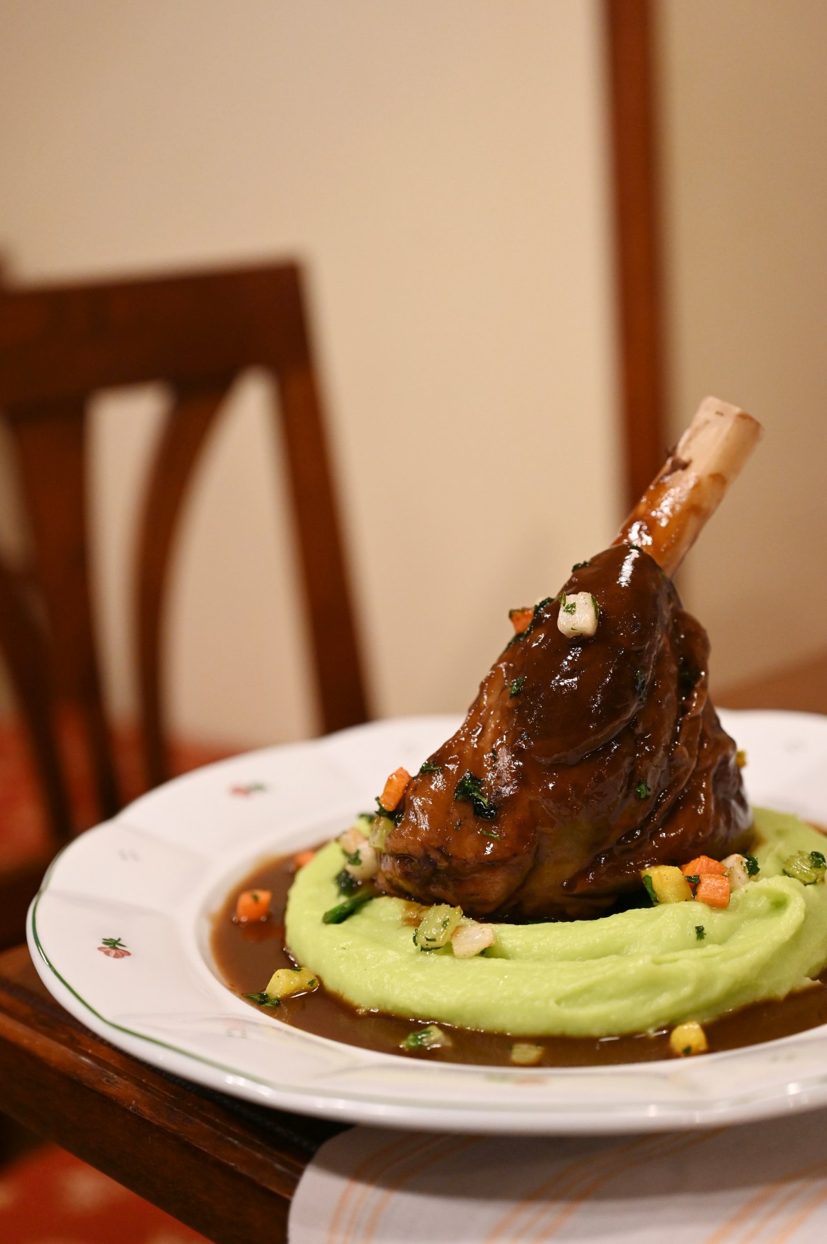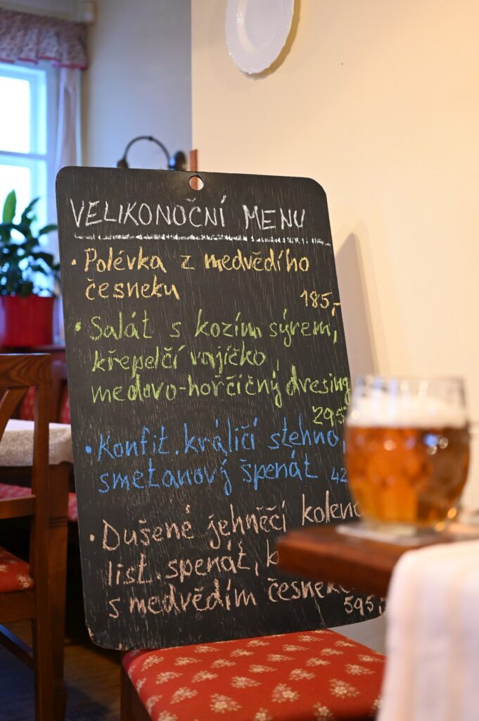 Já ho zvládnu i jako dezert, ale pokud máte mlsný jazýček, tak doporučuji ovocné knedlíky z tvarohového těsta. Z menu jsem tentokrát zvolil ochutnávku velikonočního menu, a tak přišla na řadu polévka z medvědího česneku servírovaná s křepelčím vajíčkem a následně dušené jehněčí kolínku se špenátem. Ale nebojte se, místní tradiční recepty nejsou přesnou kopií naší původní rakousko-uherské kuchyně, spíše živou součástí současnosti – výrazně lehčí a svěžejší, nicméně stále hluboce české.