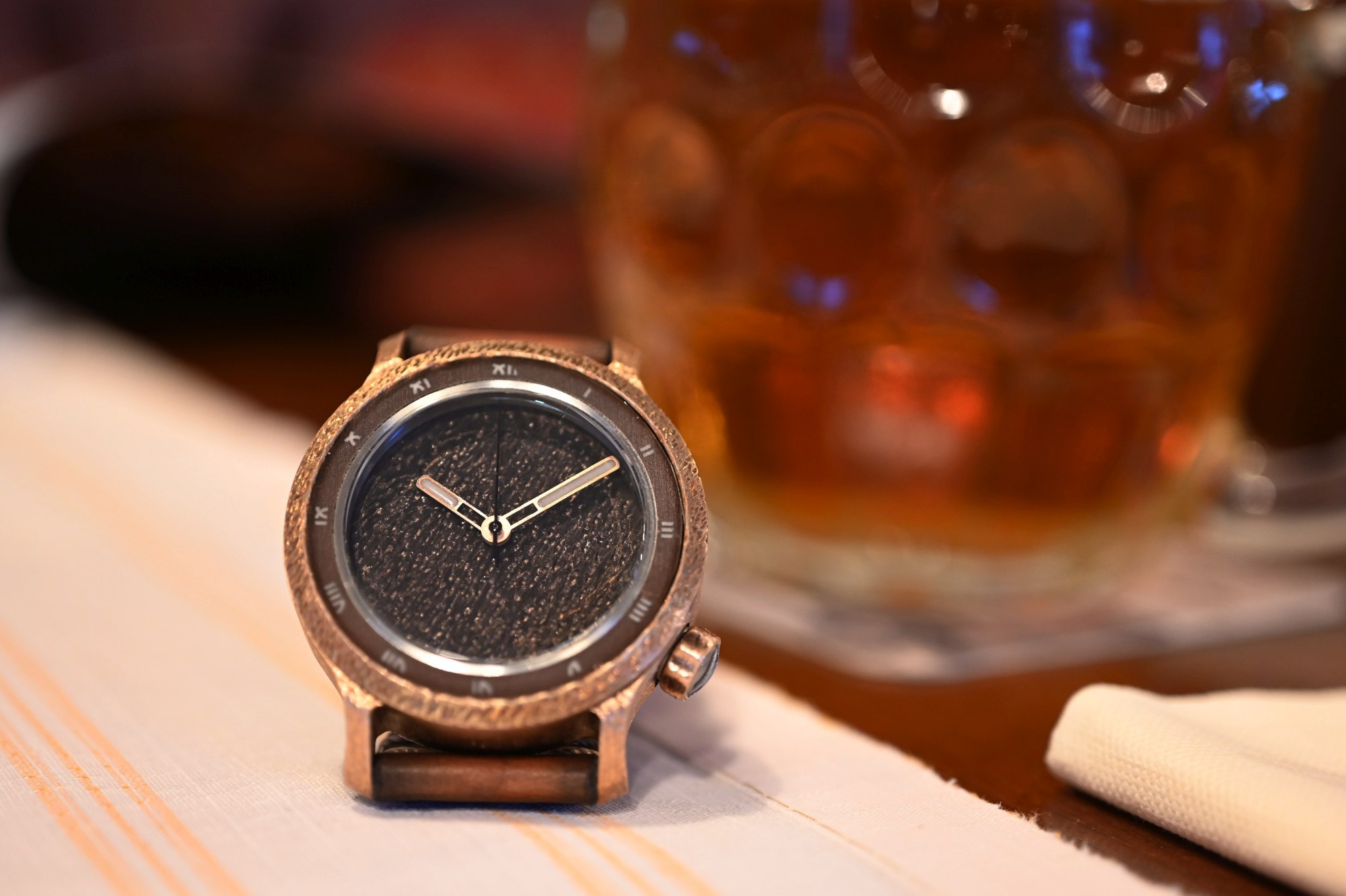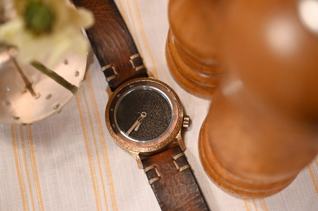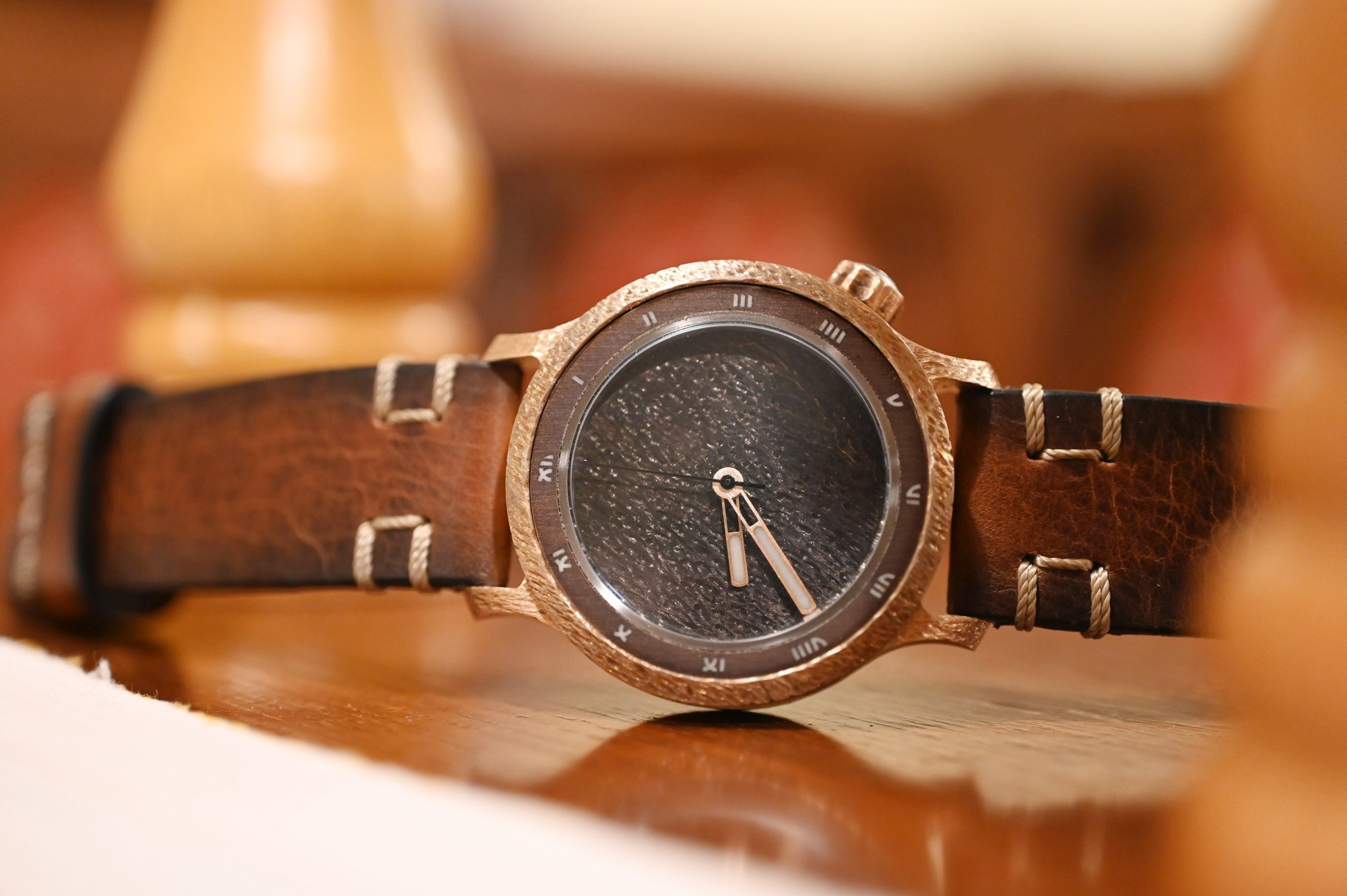 Ale zpět k hodinkám. Opět se jedná o unikátní kus. Beeman znovu zvolil originální recepturu a na pomoc si přivzal diamantovou stopkovou frézu, která udělala své. Ručně tak vytvořil neopakovatelný dekor plochy tmavě hnědého číselníku, jehož motiv se opakuje na lunetě a nožkách bronzového pouzdra.