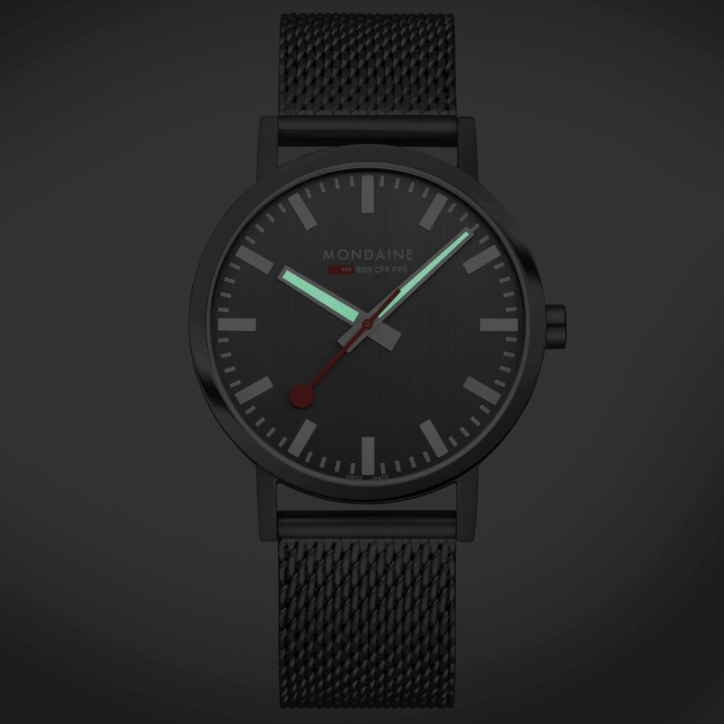 Antracitový číselník vytváří rafinovaný kontrast s výraznými hodinovými a minutovými indexy a ikonickou červenou sekundovou ručkou, čímž zachovává vysokou čitelnost, která charakterizuje designové dědictví značky Mondaine. Pro zvýšenou funkčnost disponují ručky technologií Super-LumiNova, která zajišťuje jasnou čitelnost v podmínkách slabého osvětlení.