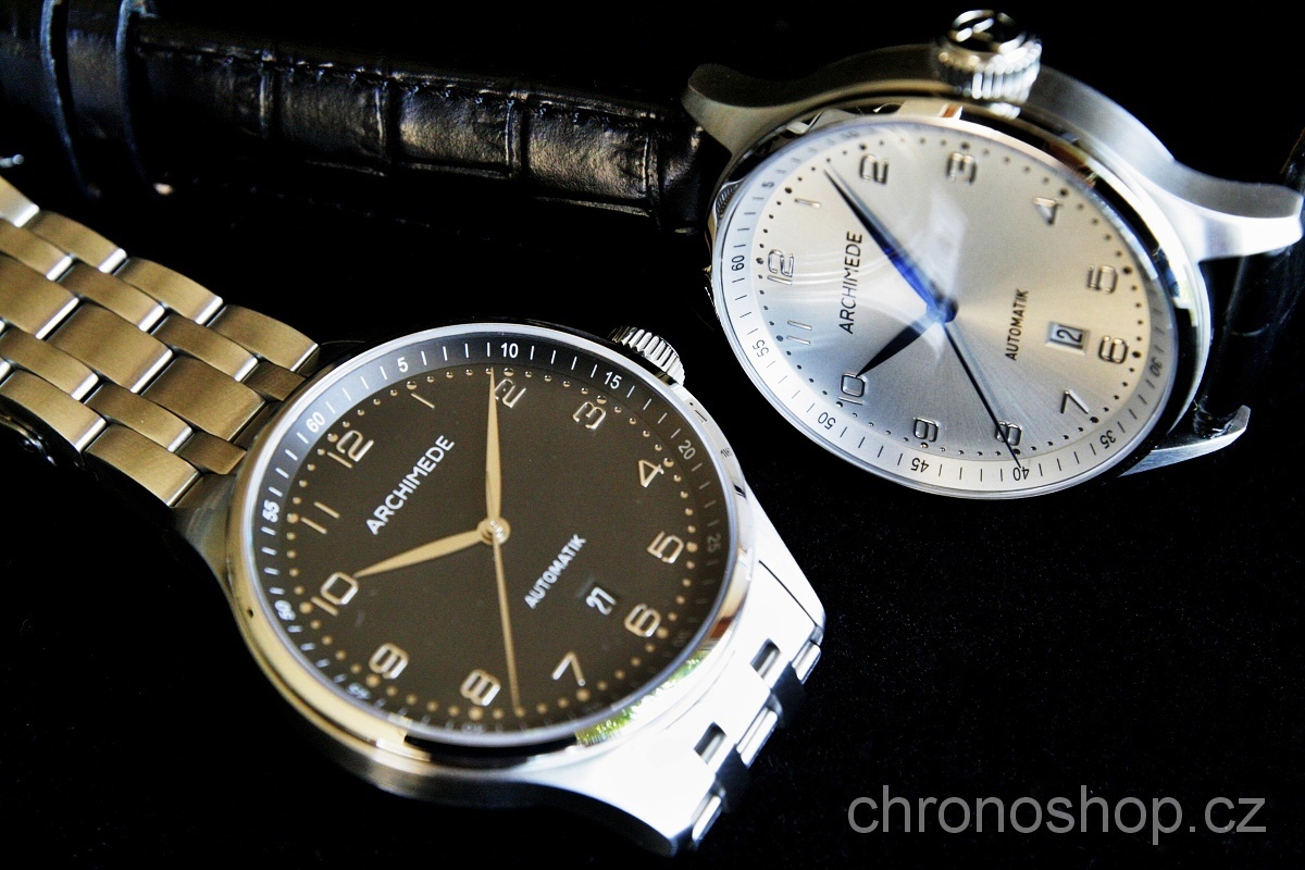 Tato značka patří spolu s dalšími (Limes, Defakto) firmě Ickler, jejíž historie se datuje od roku 1924. Rodinnná firma nejdříve vyráběla hodinková pouzdra, která dodávala dalším (i velmi renomovaným) hodinářským značkám a v poslední generaci již produkuje i vlastní hodinky výše uvedených značek. Pod značkou Archimede nalezneme jak hodinky pilotní a sportovní (SportTaucher, Outdoor Sport), tak i hodinky společenské (1950’s, Klassik). A právě z modelové řady Archimede Klassik budeme dnes vybírat. Nalezneme v ní totiž modely tří různých velikostí (36, 39 a 42 milimetrů) v několika barevných variantách (bílá, stříbrná, hnědá, modrá, černá), takže nakombinovat dvoje hodinky do páru je velmi snadné.