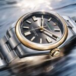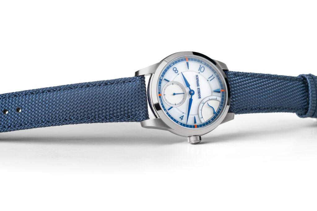 Decentní 39mm pouzdro z titanu páté třídy spojuje lehkost, pevnost a odolnost vůči korozi. Díky kombinaci leštěných a saténových ploch působí technicky i elegantně zároveň, což podtrhuje i modrý textilní řemen s gumovou podšívkou. A to je skvělý detail. Značka zde totiž po dlouhé době nevyužila stárnoucího aligátora, ale vsadila na materiál, který má v současné době úspěch…