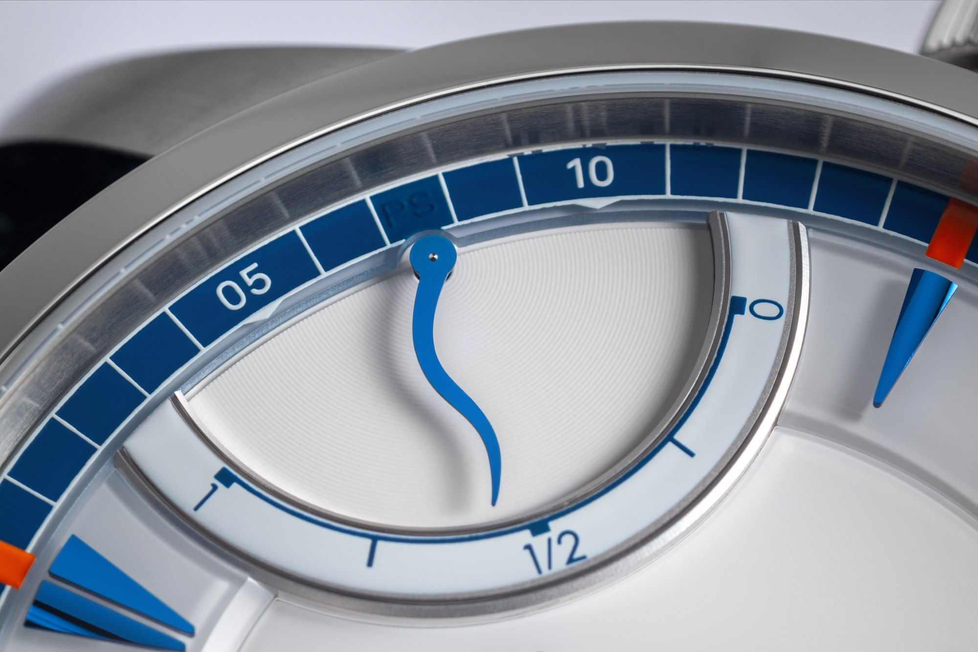 Absolutně nádherný číselník je samostatnou kapitolou. Tvoří jej více vrstev tvarovaného safíru o extrémně malé tloušťce, někdy pouhých 0,35 mm. Tyto transparentní vrstvy vytvářejí iluzi hloubky a „plovoucí“ struktury. Kombinace matných a leštěných ploch, bílého laku a pruské modři zachycuje světlo s nečekanou dynamikou. Periferní detaily doplňují oranžové akcenty, které dodávají jinak čisté kompozici energii.