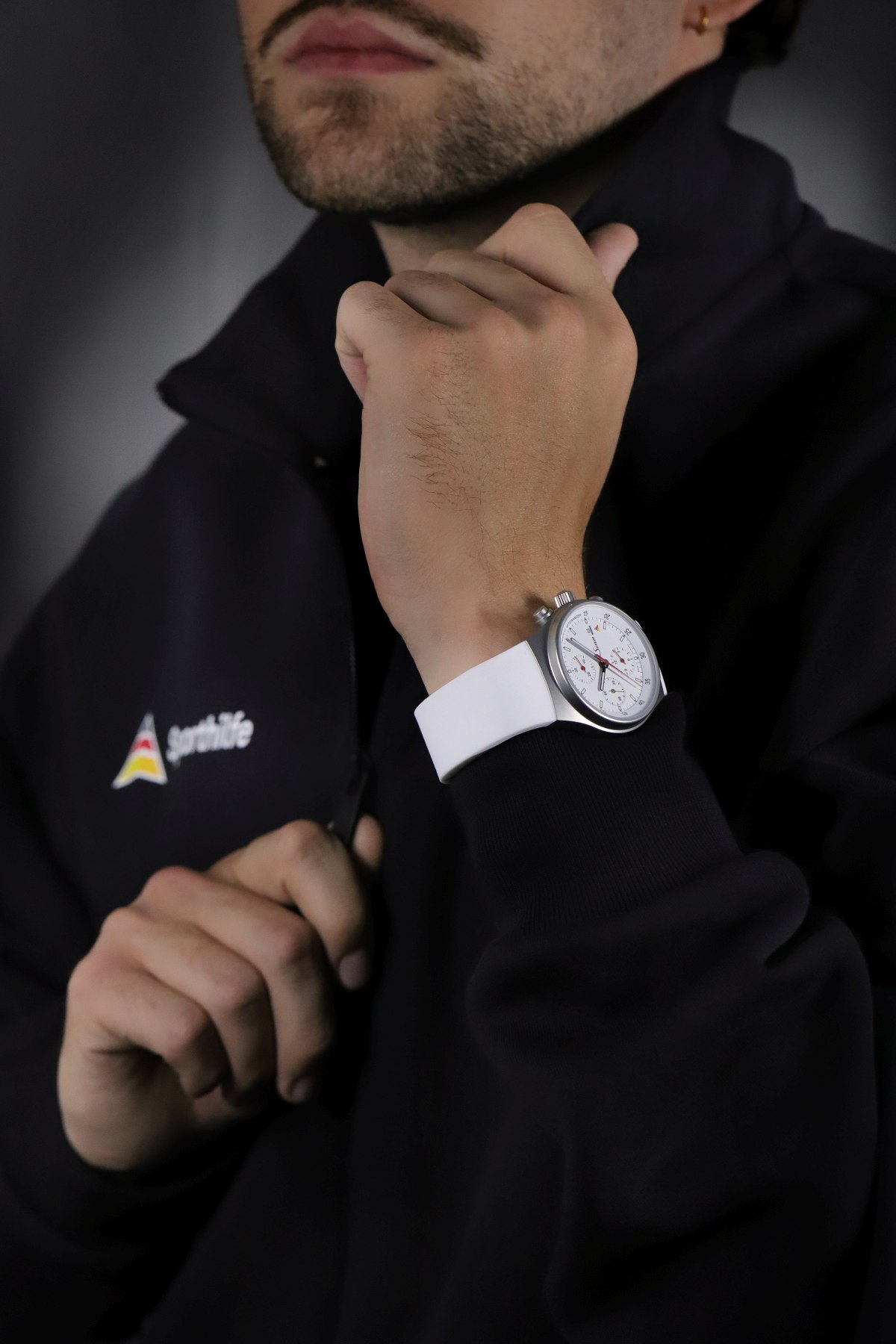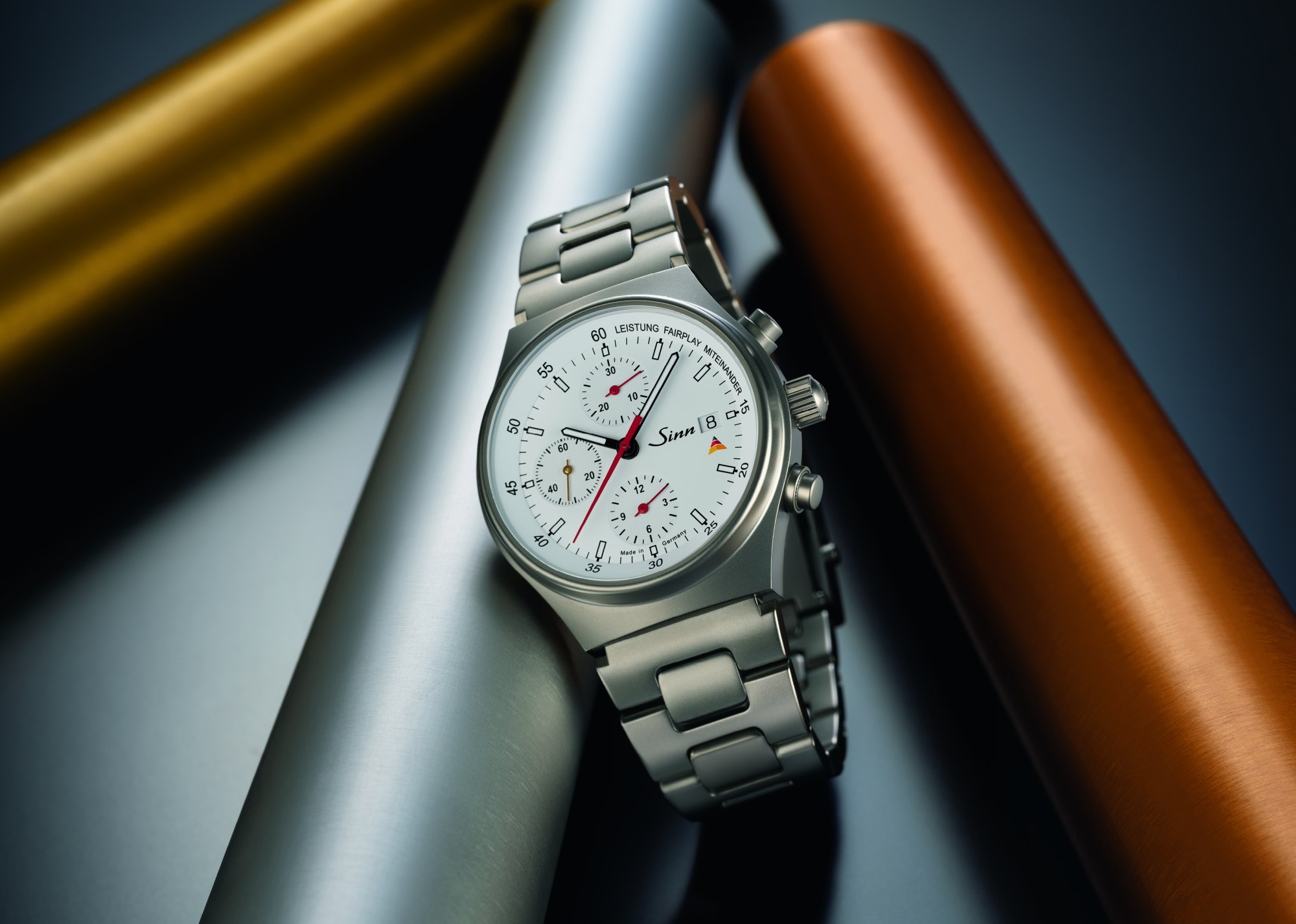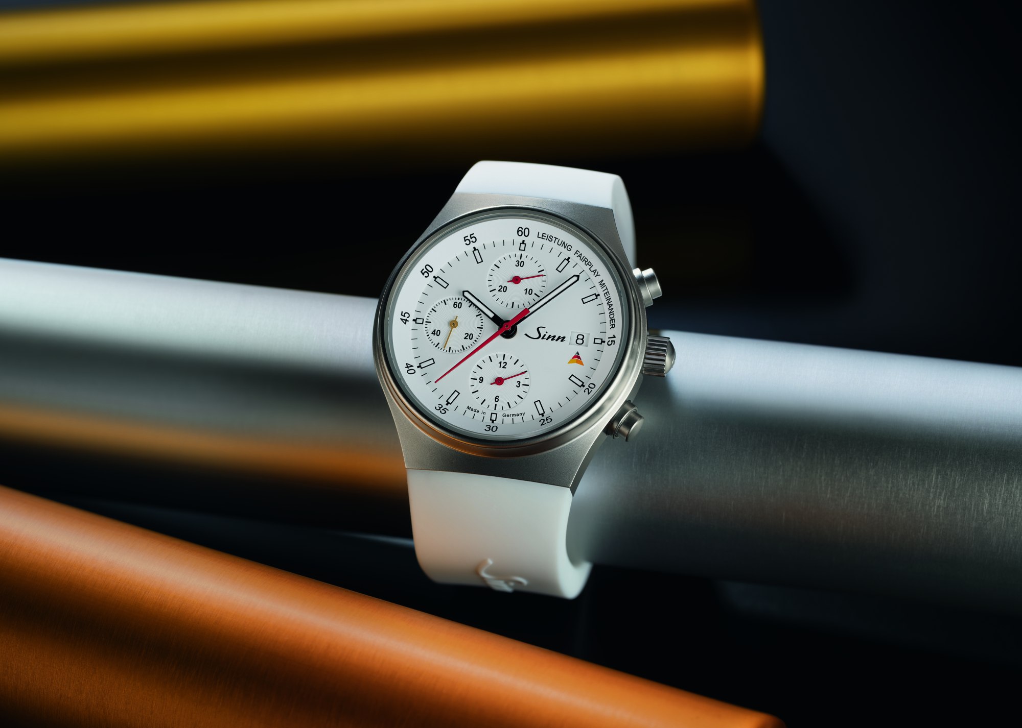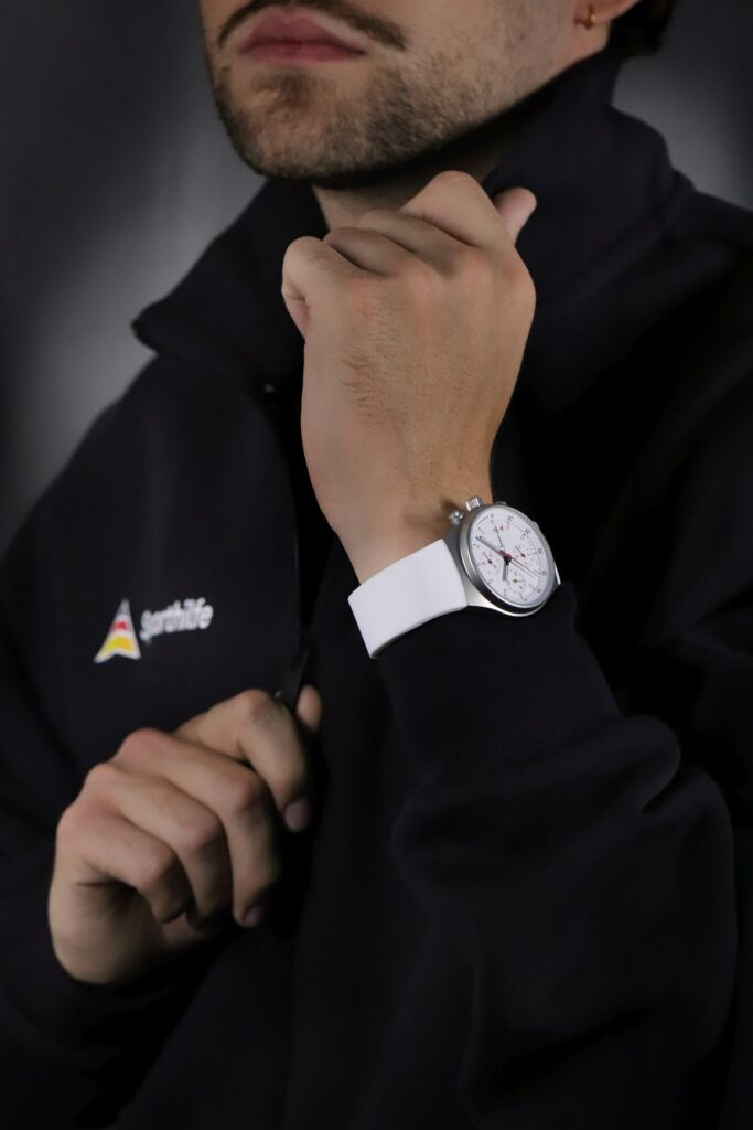 Číselník v bílé barvě je nositelem symboliky. Na vnitřním prstenci se nenápadně objevují slova „Performance. Fair Play. Togetherness.“ – hodnoty, na nichž Sporthilfe stojí. Pod datovým okénkem je umístěna stylizovaná pyramida, logo nadace. Zlatavě tónovaná sekundová ručka dodává jinak technickému vzhledu jemný, téměř ceremoniální akcent.