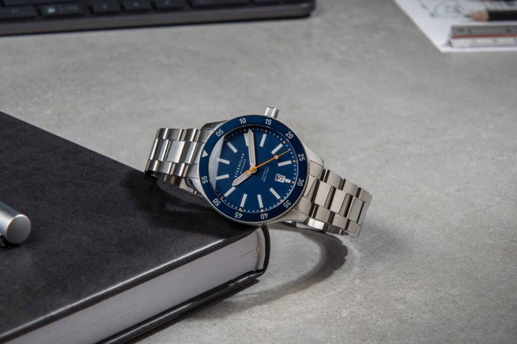 Ciferník v tmavě modrém odstínu reflektuje hloubku oceánu a je navržen jako vysoce kontrastní informační plocha. Rozšířené indexy a dvoubarevná Super-LumiNova výrazně zvyšují orientaci ve zhoršených světelných podmínkách. Oranžová sekundová ručka plní nejen estetickou funkci, ale umožňuje okamžité vizuální potvrzení chodu strojku.