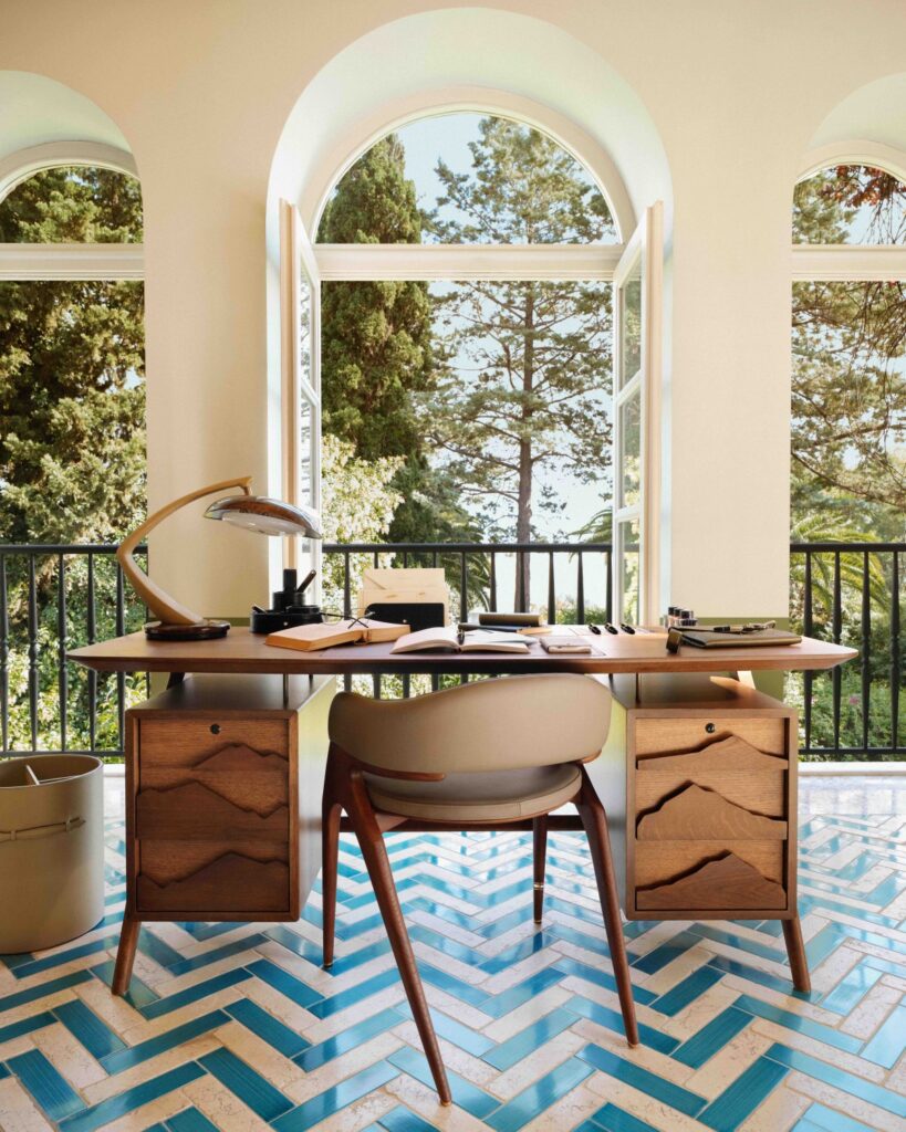 Psací stůl Montblanc, poprvé představený v lednu 2024 během pařížského týdne módy, je vyroben převážně z masivního dubu v duchu mid-century modern. Kožená podložka, precizně zpracované přihrádky a ikonické detaily – například tři prstence z pryskyřice v barvě růžového zlata inspirované perem Meisterstück – podtrhují spojení řemesla a designu. Úchytky zásuvek pak evokují siluetu hory Mont Blanc.