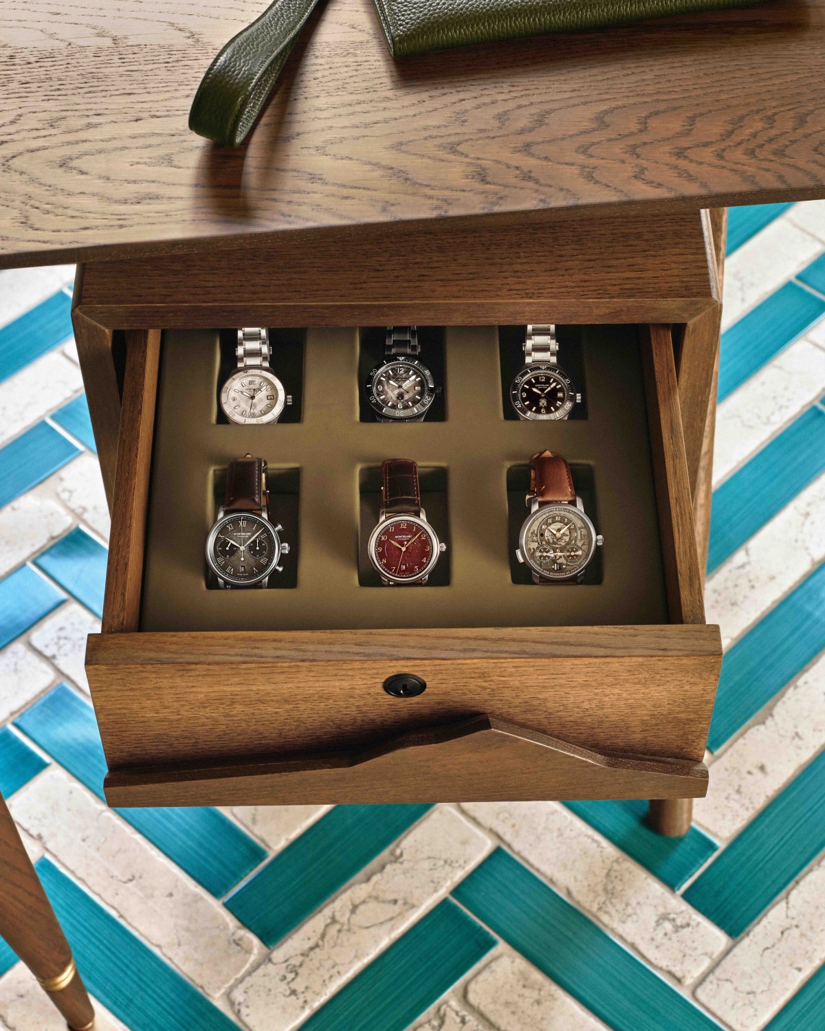 Součástí nového konceptu Montblanc Art of the Desk není jen psací stůl, ale i promyšlený úložný prostor – včetně speciální zásuvky na hodinky, určené až pro šest kusů. Tento uzamykatelný šuplík se má stát bezpečným útočištěm pro osobní časomíry, které doplňují kreativní svět svého majitele.