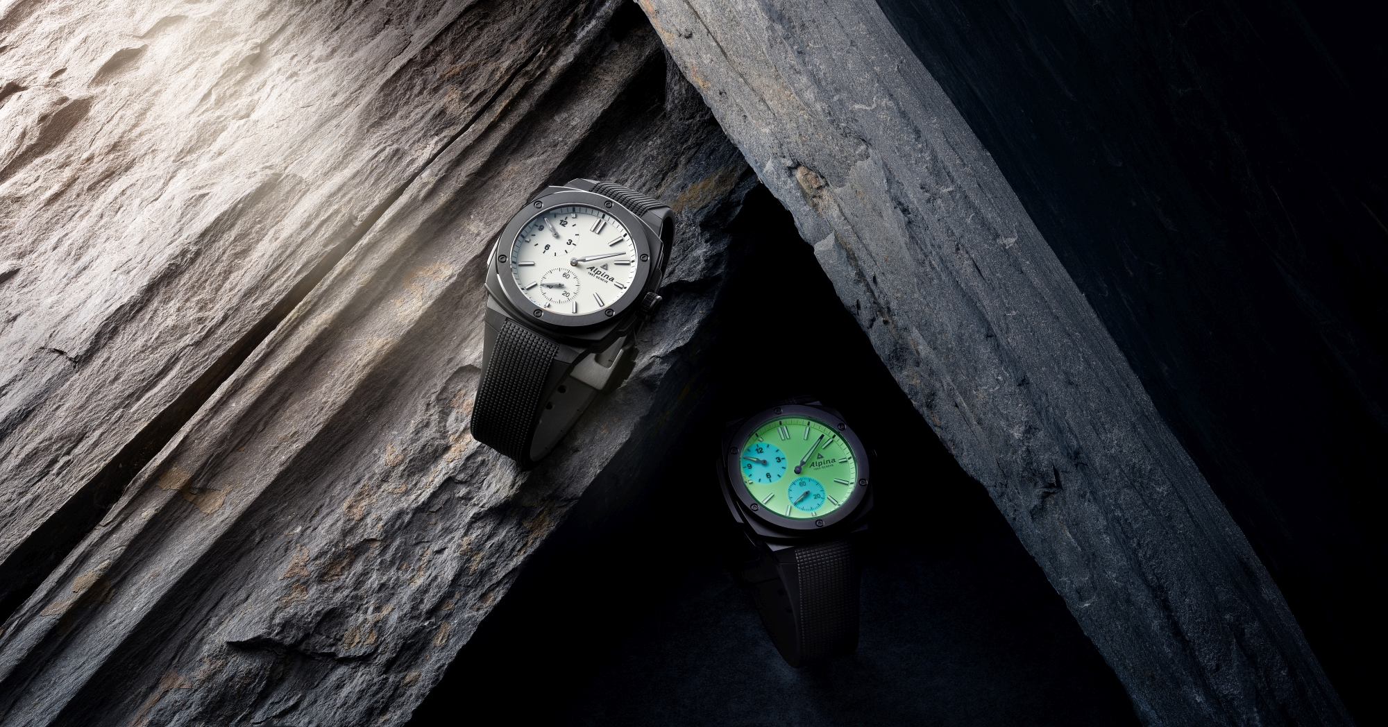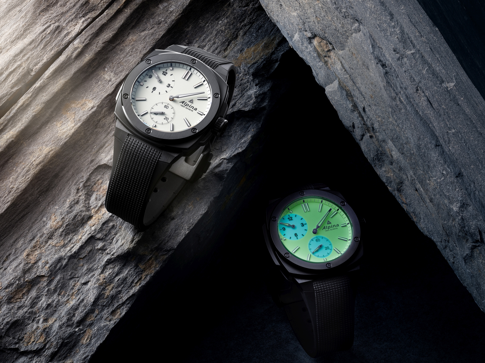 Hodinky Alpiner Extreme Regulator Automatic mají fascinující schopnost proměny. Za denního světla vynikají čistou bílou elegancí. Jakmile nastane tma, odhalí úplně jinou tvář – luminiscenční zelené pozadí vytváří scénu, na níž dva regulátorové sčítače září modře, zatímco ručky s indexy zůstávají věrné zelené.
