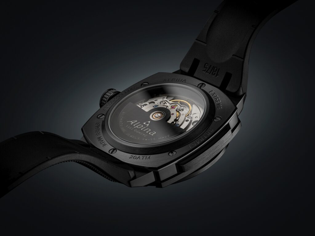 Tato dualita dne a noci se promítá do designu nových hodinek Alpiner Extreme Regulator Automatic: číselník svítí jako den, pouzdro kontrastuje nocí. Konstrukčně vychází z leštěné oceli se saténovým povrchem v černé úpravě DLC. Stejný odstín nese texturovaný gumový řemínek i korunka v pozici 3 hodiny, opatřená gumovým úchytem pro pohodlnější ovládání.