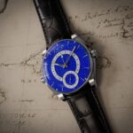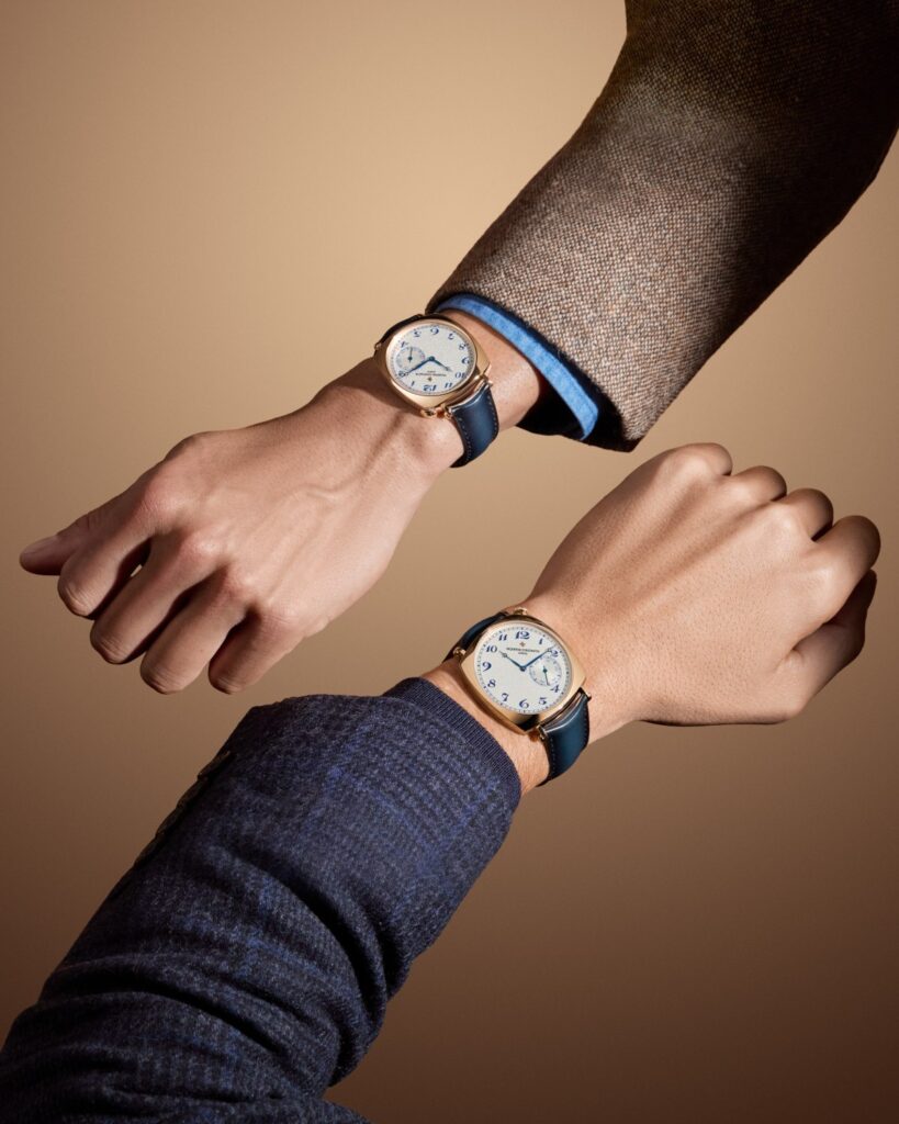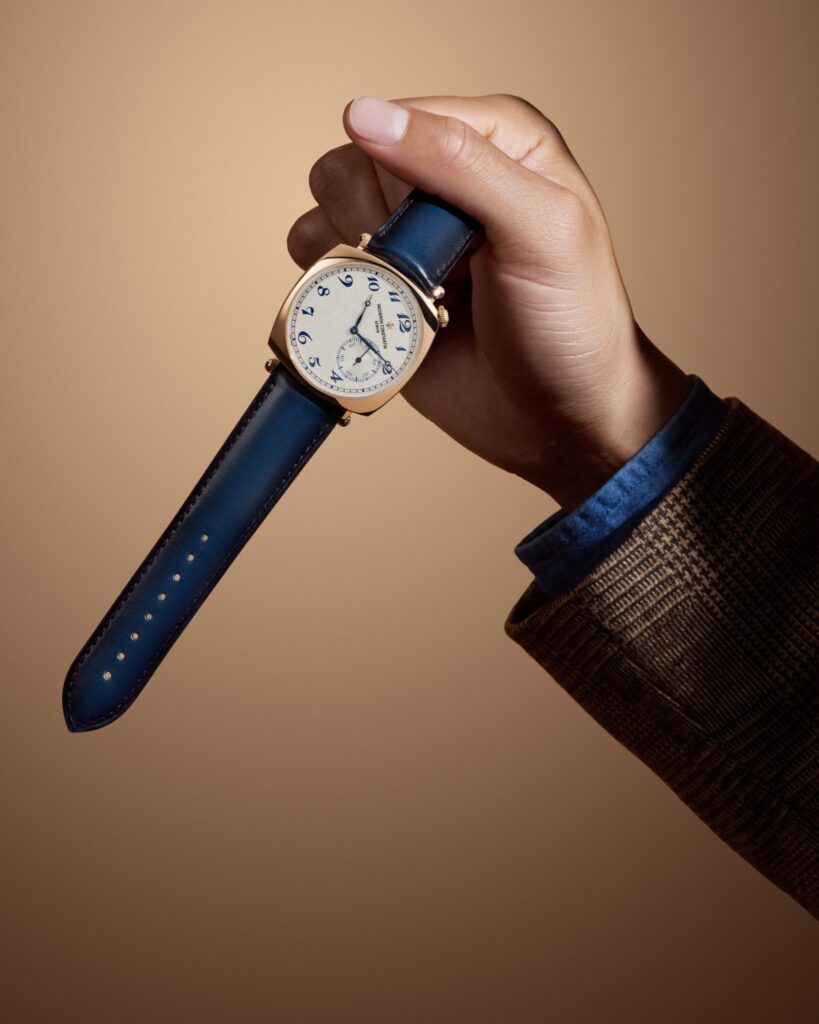Letos nové modely pro kolekci Historiques přinášejí tuto ikonickou siluetu v moderním provedení. Ciferník v zrnitě stříbrném tónu doplňují výrazné modré arabské číslice a ručky ze zlata. Kombinace různých povrchových úprav – od saténového okraje po jemné spirálování malé sekundové ručky – vytváří jemné napětí mezi strukturou a světlem. Celek završuje tmavě modrý kožený řemen s patinovaným gradientem, který dodává hodinkám hloubku i charakter.