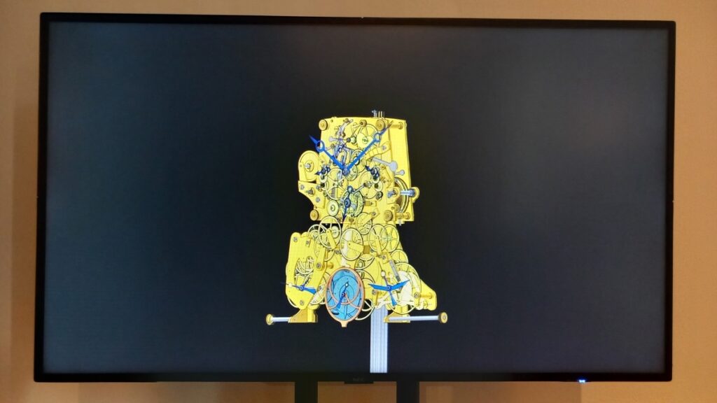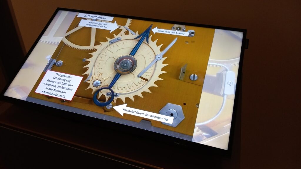 Velký prostor je věnován detailům vnitřní konstrukce. Návštěvníci získají bližší pohled na věčný kalendář, astronomické funkce a materiály použité při stavbě strojku. Interaktivní prvky navíc umožňují aktivní zapojení – od tvorby technického výkresu až po práci s 3D modelem věčného kalendáře. Součástí expozice je také mobilní aplikace s audiosoubory a tematickými kvízy, která umocňuje zážitek a přibližuje atmosféru dvacátých let minulého století.