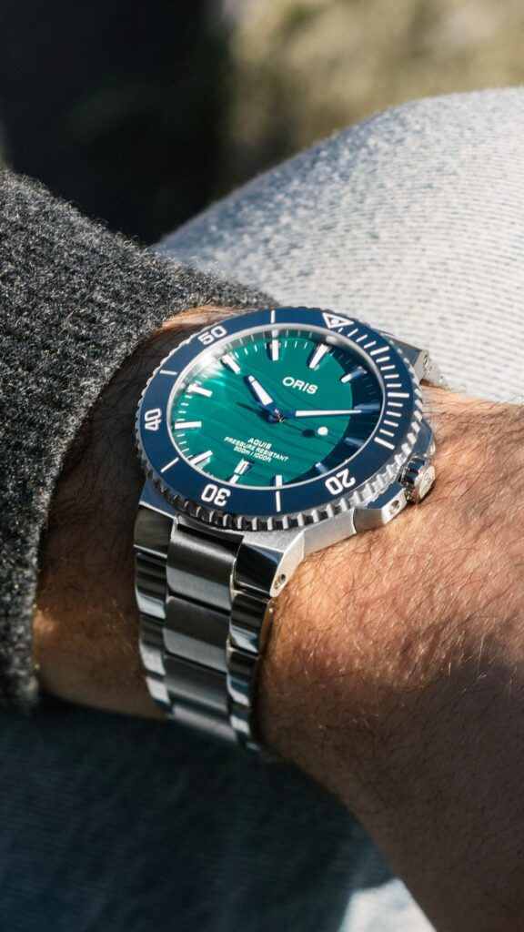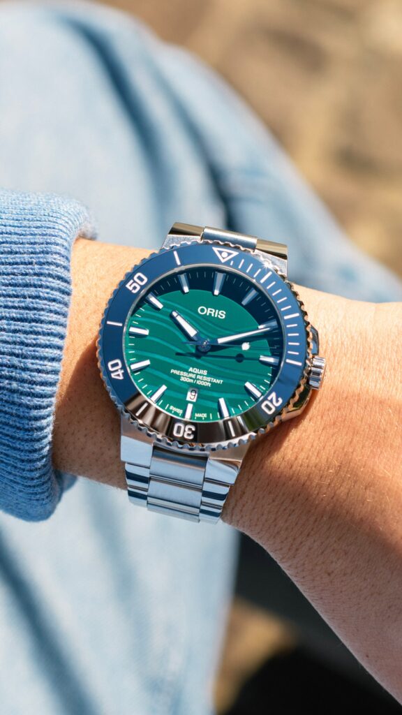 Aquis Date 43,50 mm Yangtze Jiangtun Limited Edition, s cenovkou 67 590 Kč, jsou velmi univerzální moderní potápěčské hodinky. Mají pouzdro z nerezové oceli a zúžený tříčlánkový kovový náramek, luminiscenční ručky a hodinové indexy, jednosměrně otočnou lunetu s wolframovou vložkou a minutovou stupnicí a šroubovací korunku. Jsou vodotěsné do 300 metrů a poháněné automatickým švýcarským mechanickým strojkem Sellita SW200-1 s přidaným firemním červeným rotorem. Značka tak strojek značí jako Calibre Oris 733.